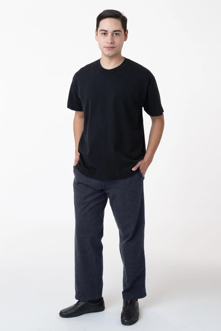 Meet your new go-to pant. Perfect for day or night, lounge or active. Straight leg with elastic drawcord waistband for an adjustable fit. Style runs true to size. Features two side pockets and one back pocket. These pants are part of our garment dye line, which is always custom dyed, shrink-free and sewn with 100% USA-grown cotton.