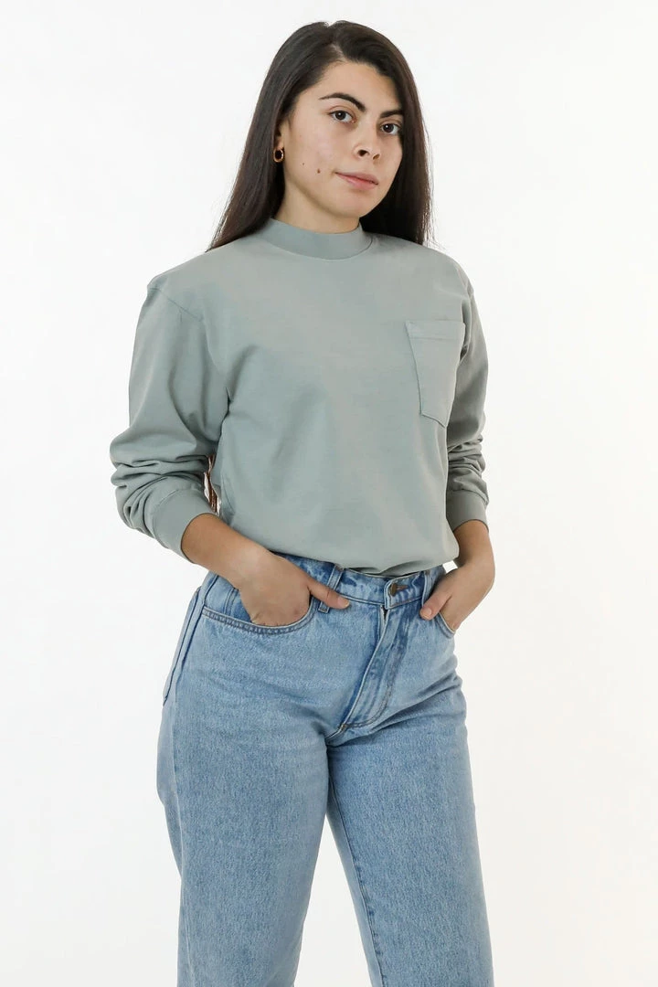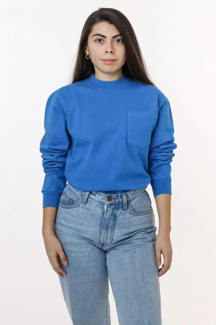 This unisex work shirt is made of our super heavy 8.5 oz., 12 singles jersey which features more structure than a more lightweight jersey. This workwear-inspired shirt features extra room in the sleeves and body width so it can be layered with your favorite undershirts, a round mock neck collar, and a pocket to keep anything you need on hand at all times. This style is also 2 inches shorter than similar styles in body length for a boxy look when worn untucked, and for less bulk when tucked inside.