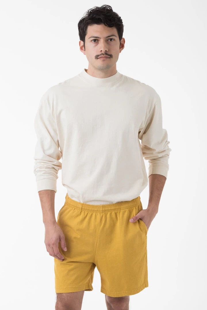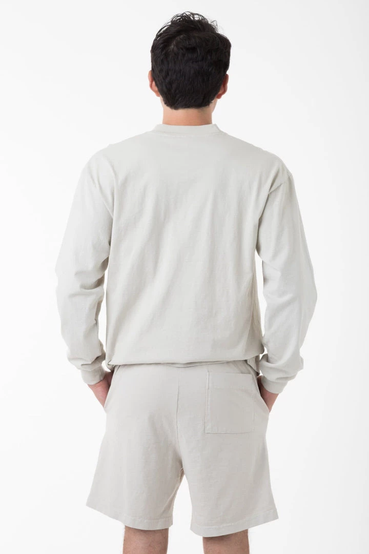 The Mid-Length Heavy Jersey Shorts, featuring a drawcord elastic waistband for a personalized fit, and a length cut for optimal coverage. We’ve included 2 front pockets as well as a back pocket to keep all your essentials close. These shorts are part of our garment dye line, which is always custom dyed, shrink-free and sewn with 100% USA-grown cotton.