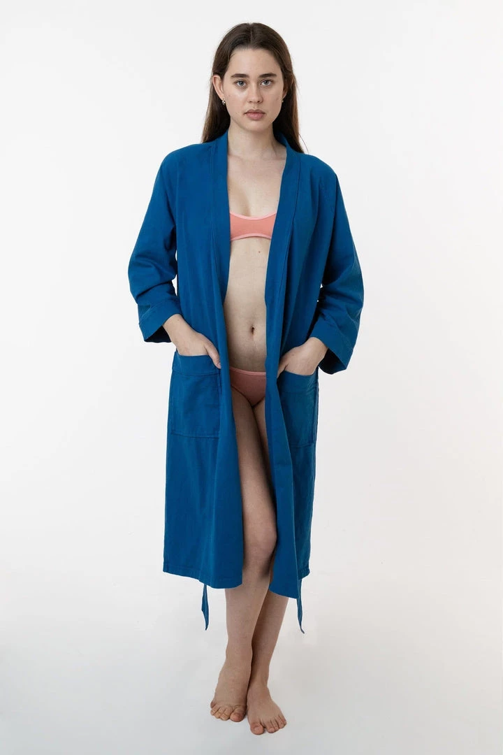 Our House Robe is made of 100% cotton and can be worn in and out of the house. Made of heavy jersey, it’ll be your new staple after a bath, as a poolside coverup, and for a casually chic look at home or while you’re out running errands. Features 3/4 raglan sleeves, 2 front pockets, and a waistband that’s attached to the back so you’ll never misplace it. Tie the straps in a knot at the back if you’d rather wear this piece untied. This style is also garment dyed and shrink-free.