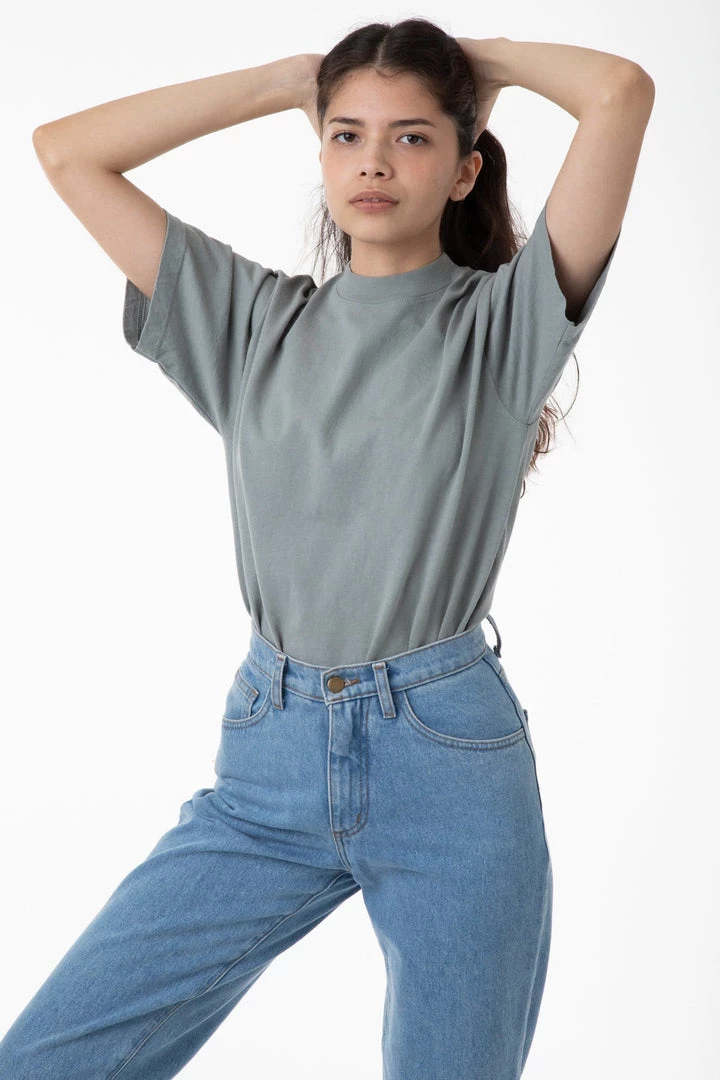A heavier version of original garment dye tee with a mock neck for a more modern shape. Same loose, boxy fit with a higher neckline and beefier texture. This tee is part of our garment dye line, which is always custom dyed, shrink-free and sewn with 100% USA-grown cotton.