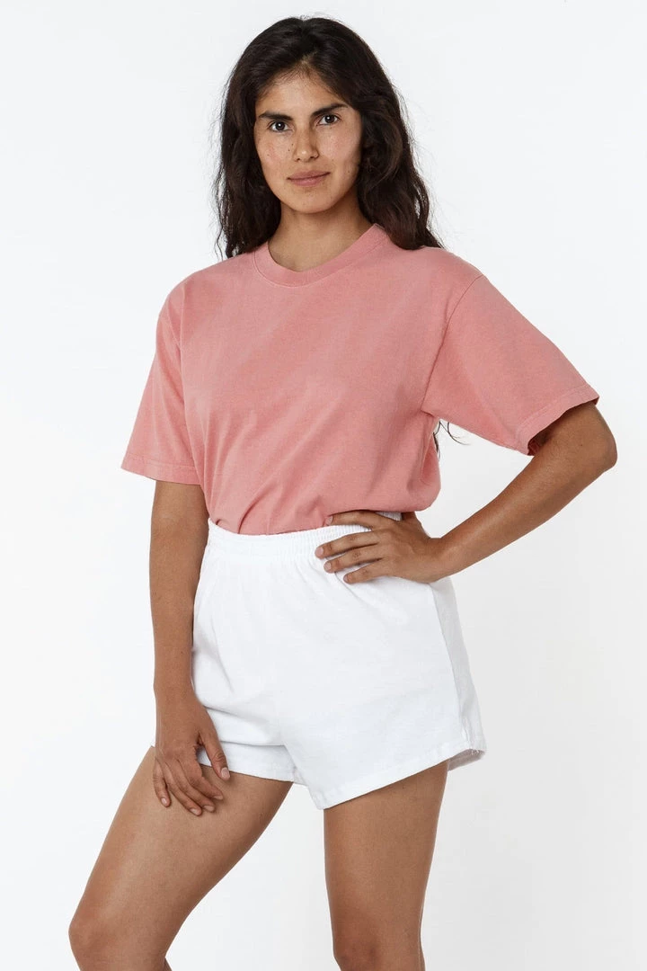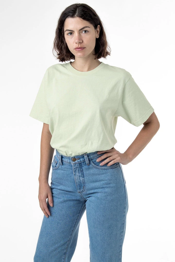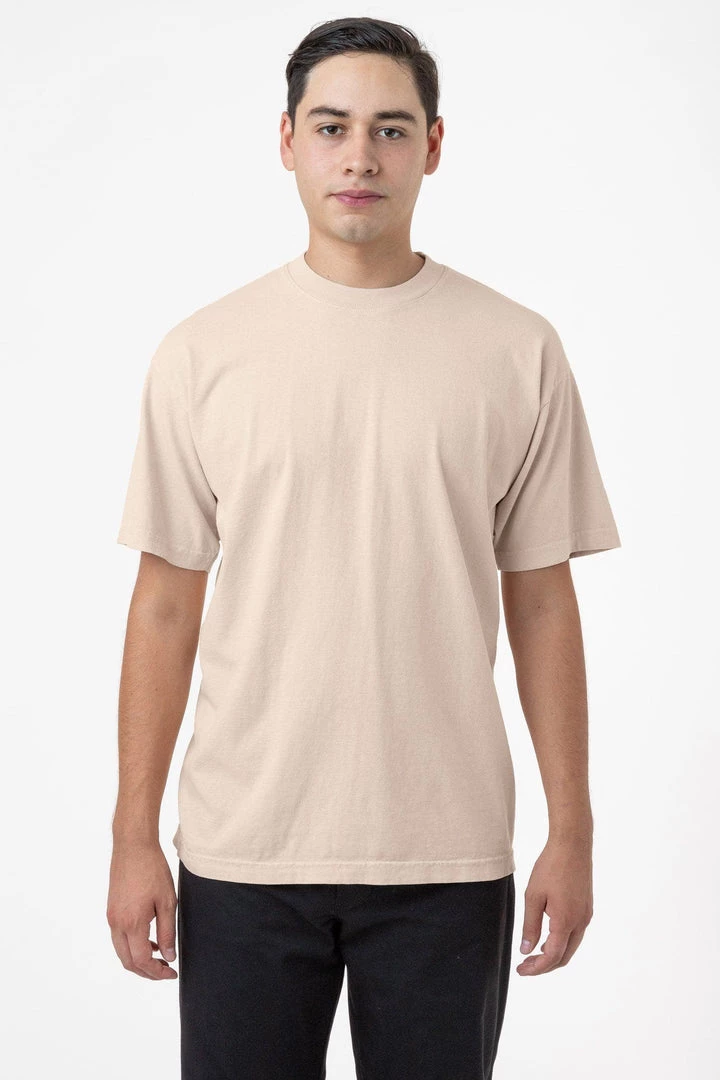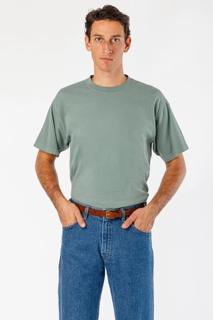 We believe this T-shirt will cause a thematic shift in the T-shirt industry. Made of 100% USA cotton, this textile is beefy, durable, and absorbent, and is virtually shrink free as a result of garment dyeing. The garment is washed with natural enzymes, resulting in a broken-in feel, just like a T-shirt that was washed or worn for a decade or two. Its special features include its heavy and sturdy feel and combined with a more generous fit (about 1 wider on the flat than a contemporary T-shirt) and higher neck line.