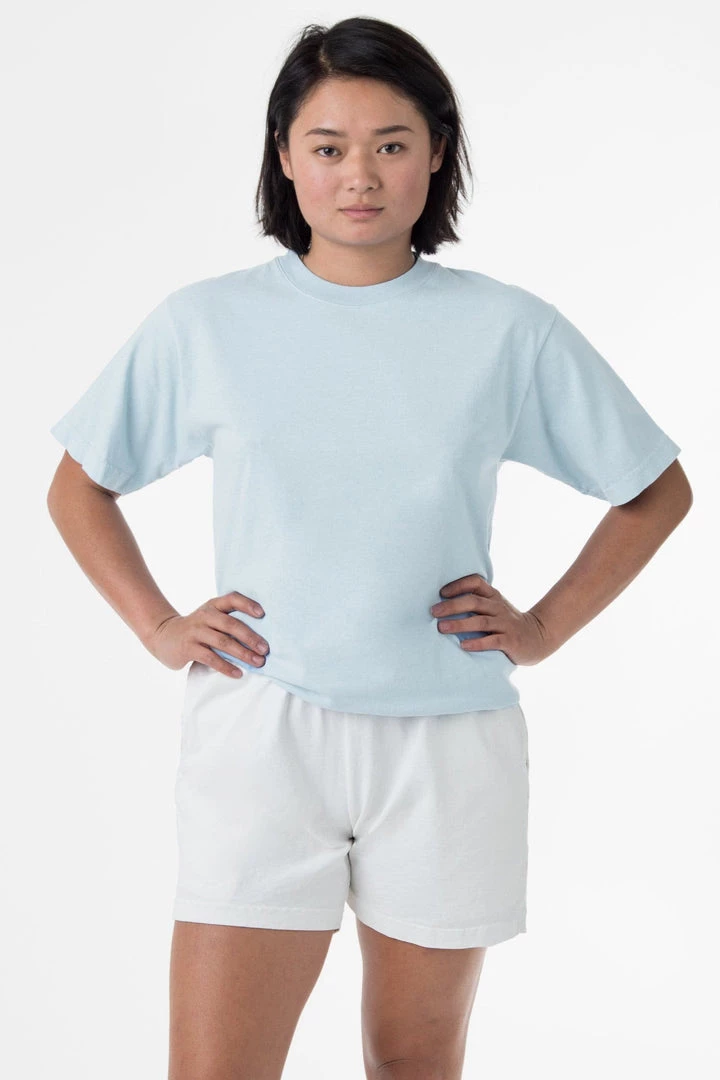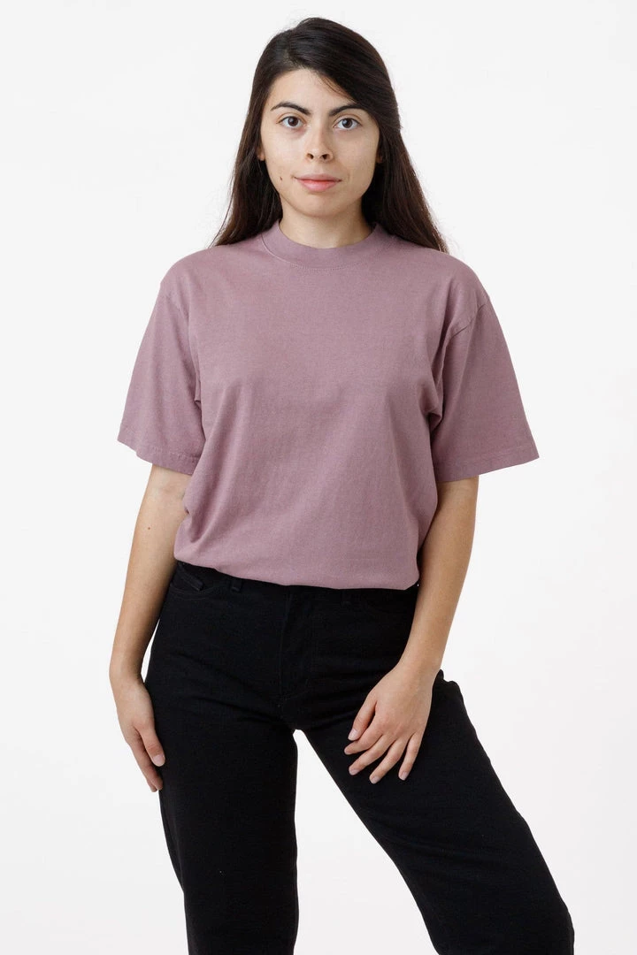 We believe this T-shirt will cause a thematic shift in the T-shirt industry. Made of 100% USA cotton, this textile is beefy, durable, and absorbent, and is virtually shrink free as a result of garment dyeing. The garment is washed with natural enzymes, resulting in a broken-in feel, just like a T-shirt that was washed or worn for a decade or two. Its special features include its heavy and sturdy feel and combined with a more generous fit (about 1 wider on the flat than a contemporary T-shirt) and higher neck line.
