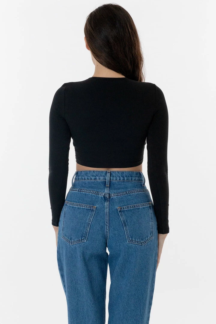 The Garment Dye Long Sleeve Crop Top is an essential styling piece with a high-crew neckline, exactly like our beloved 83078GD Crop Top. This is a comfortable and universally flattering style with cropped length and fitted sleeves to keep you warm. Pair with high waisted styles or low-rise sweats for a 90s look or match head-to-toe with our cotton spandex bottoms. This garment features extra compression and as been garment dyed and enzyme washed providing unique colorways and rich texture.