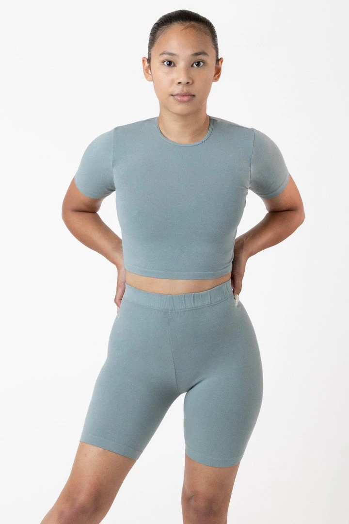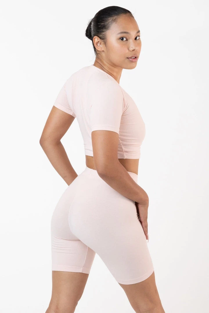 Our Garment Dye, Premium Cotton Spandex Bike Short is made of a heavyweight cotton spandex with extra compression and as been garment dyed and enzyme washed providing unique colorways and rich texture. This style is thicker and more opaque than our classic bike short with a smooth luxurious hand-feel. Featuring a mid-thigh length and 1.5″ elastic waistband that gives you a secure feeling all day long. Pair this style with our Garment Dye Heavy Fleece Sweatshirt for a vintage sportswear look or with our matching Garment Dye Short Sleeve Crop Top. Made in South Central, Los Angeles by experienced seamstresses earning fair wages.