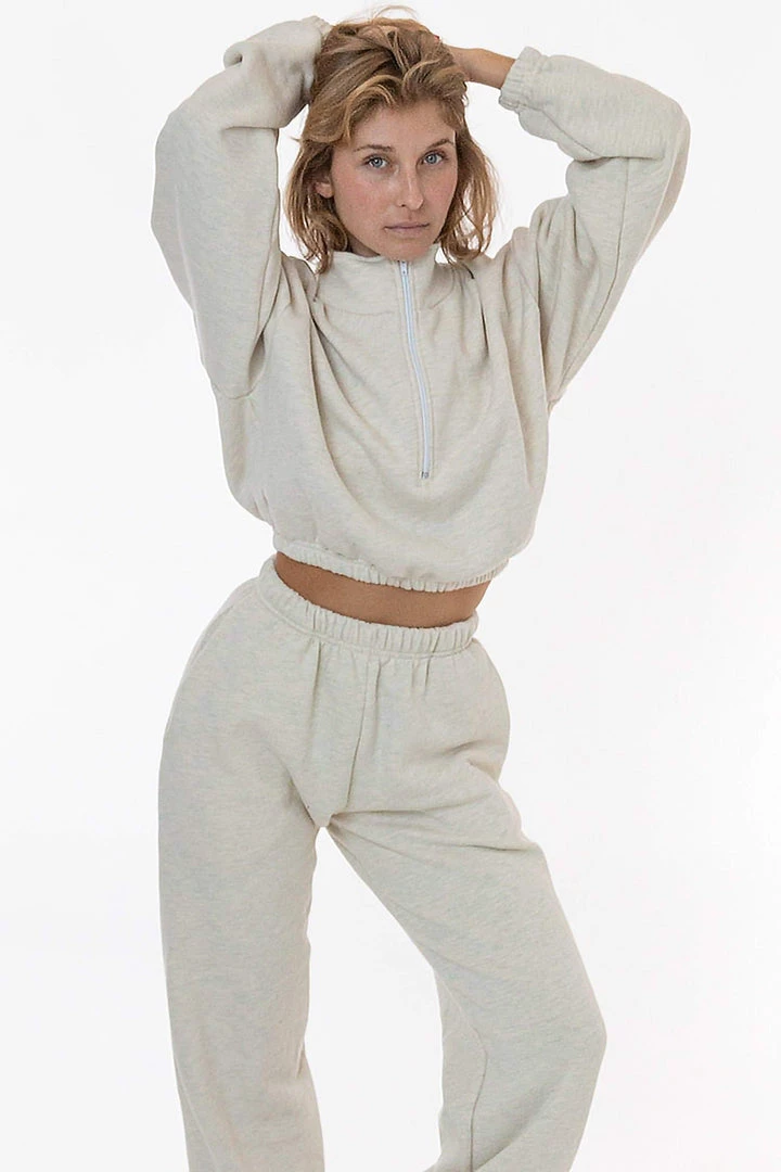 This cozy, cropped sweatshirt makes the ultimate sweatsuit when paired with our CF394 Cotton Fleece High Waist Sweatpant. This pullover features elastic hems around the middle of the waist and at the wrists and this style can be worn zipped up or down. Modeled after our F396 Flex Fleece Cropped Half Zip Pullover, this style is slightly heavier and made of cotton. Casual and functional with a generous fit to the body and arms. Perfect for layering over our crop tops and bike shorts.