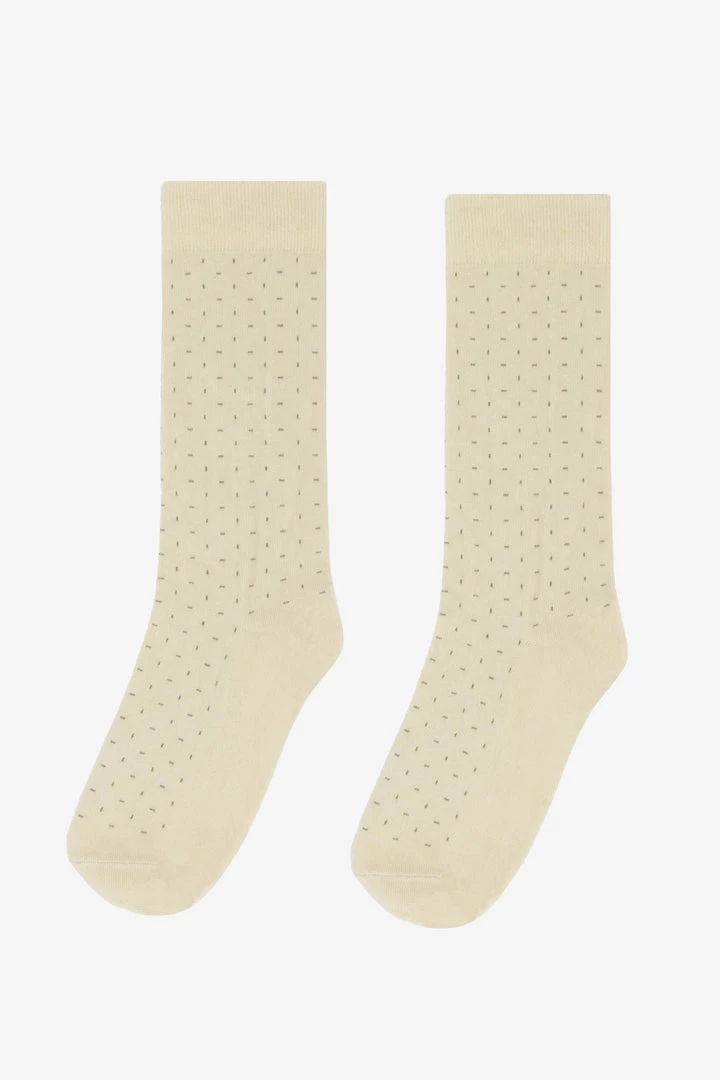 A novelty, crew-length sock with contrasting dash pattern. Unisex.