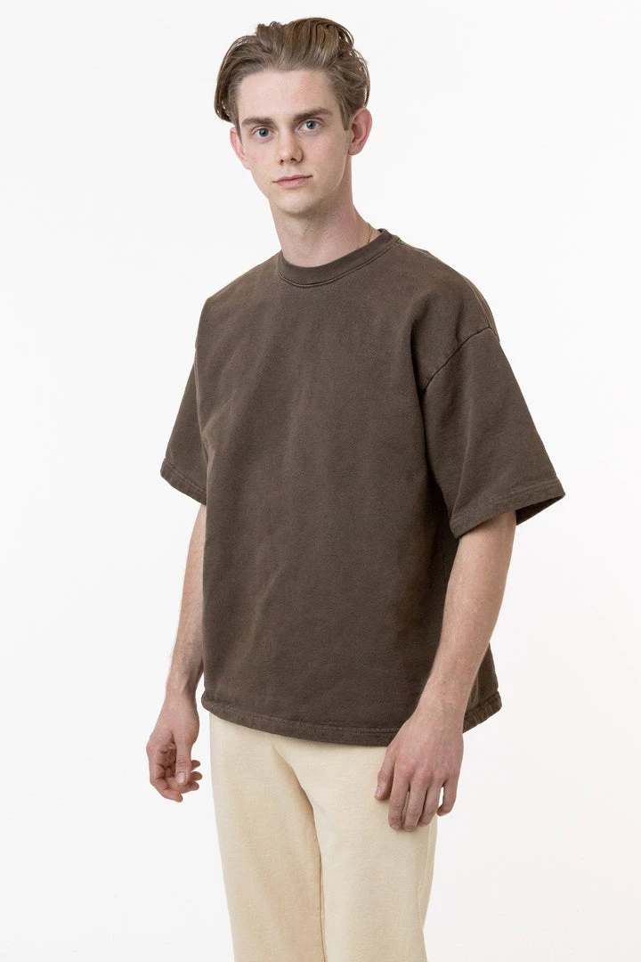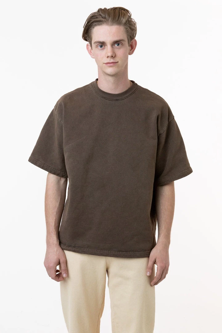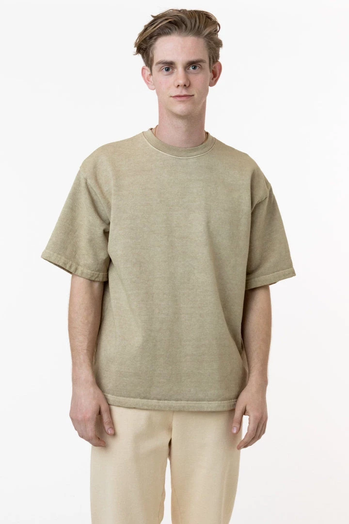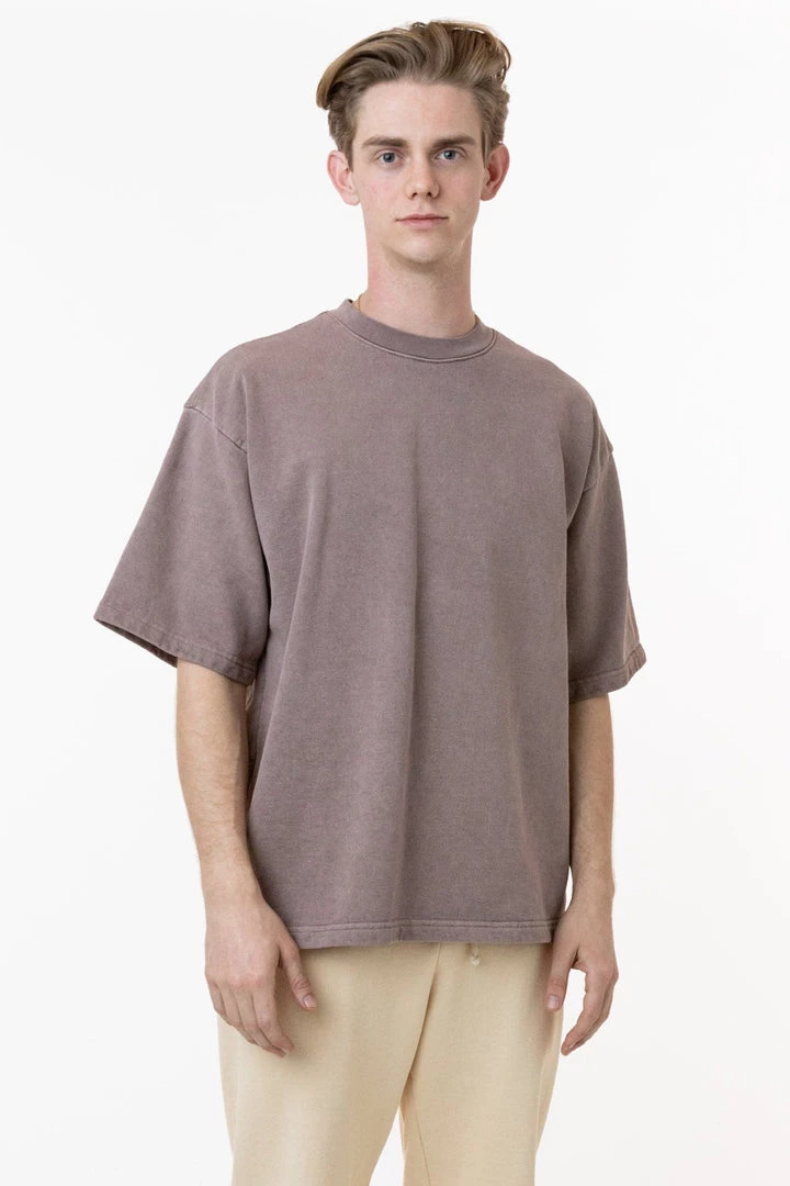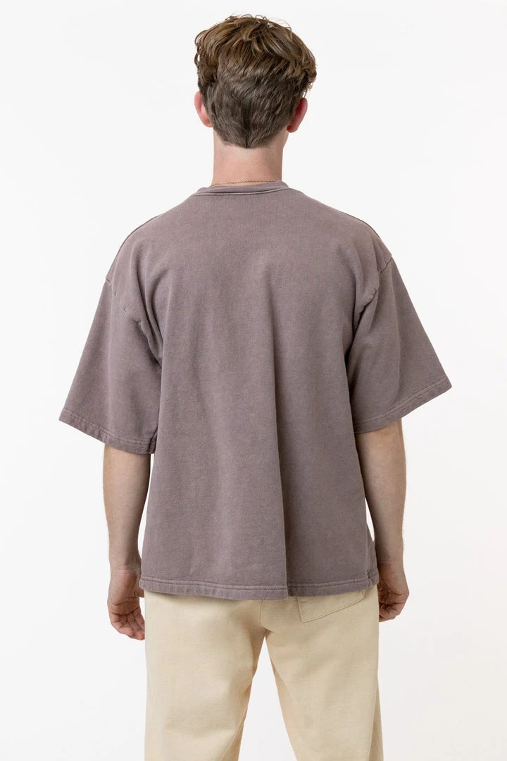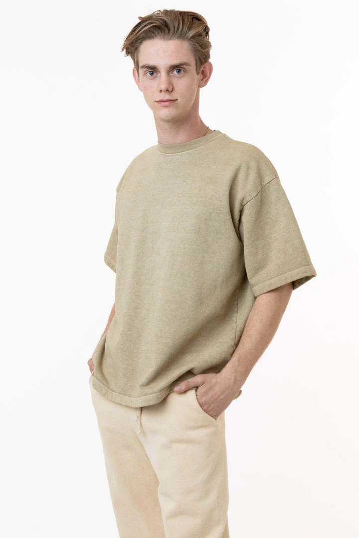 Introducing our one-of-a-kind pigment dyed heavy fleece tee. These custom-developed colors feature more depth than our regular garment dyed items and reveal the unique texture of our 14 oz. heavy fleece textile. This fleece crewneck t-shirt features a boxy silhouette inspired by vintage varsity jerseys for a sporty yet structured look for men or women.