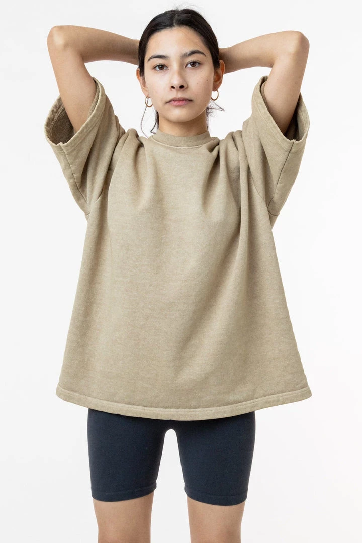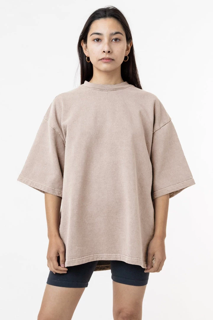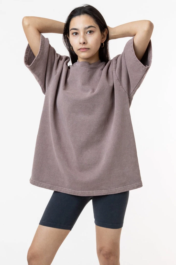 Introducing our one-of-a-kind pigment dyed heavy fleece tee. These custom-developed colors feature more depth than our regular garment dyed items and reveal the unique texture of our 14 oz. heavy fleece textile. This fleece crewneck t-shirt features a boxy silhouette inspired by vintage varsity jerseys for a sporty yet structured look for men or women.