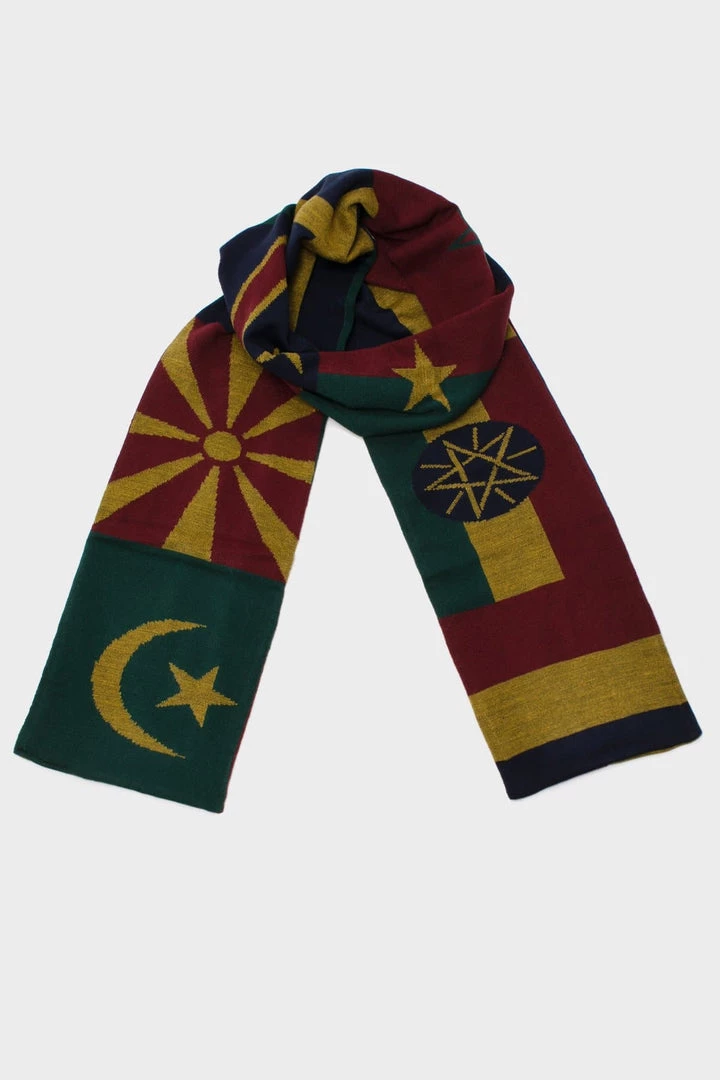 This scarf is reversible and has different country flags knit on each side.