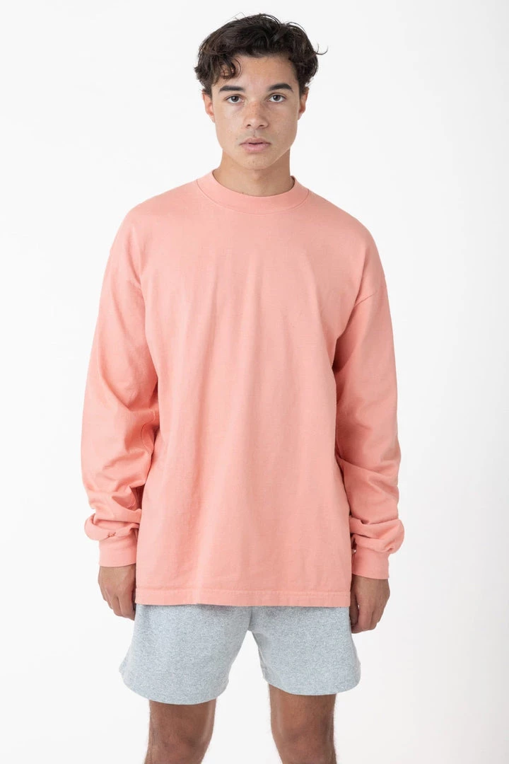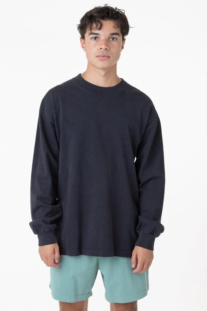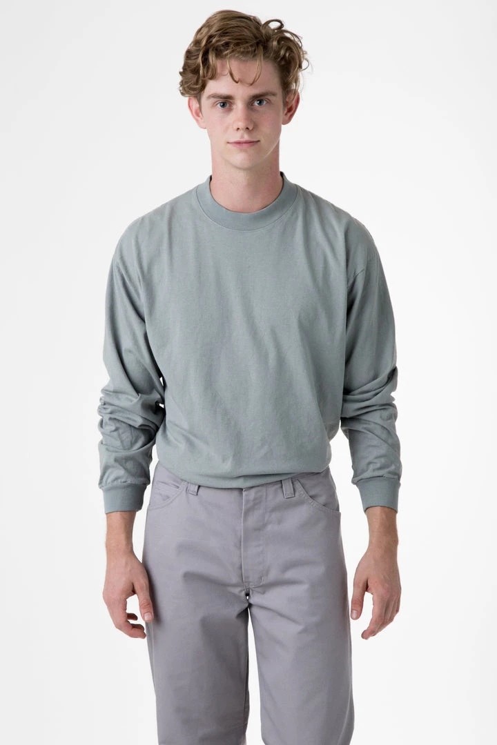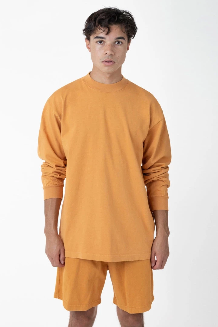 A heavier version of original garment dye tee with a mock neck for a more modern shape. Same loose, boxy fit with a higher neckline and beefier texture. This tee is part of our garment dye line, which is always custom dyed, shrink-free and sewn with 100% USA-grown cotton.