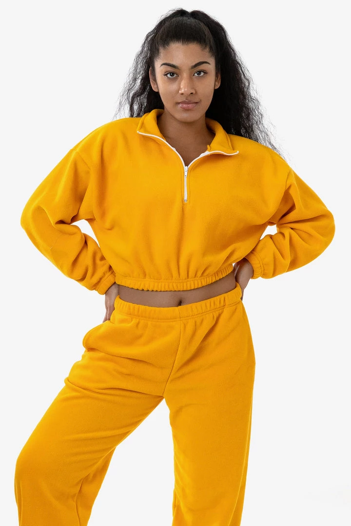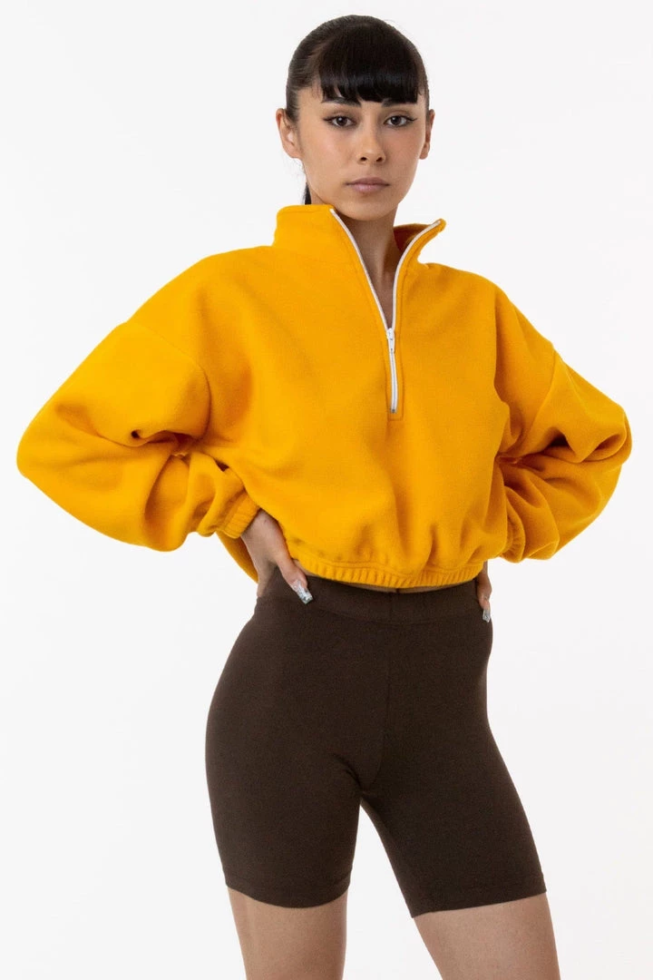 Introducing the Polar Fleece Half Zip. This unisex pullover features elastic hems around the middle of the waist and at the wrists and this style can be worn zipped up or down. Casual and functional with a generous fit to the body and arms. Perfect for layering over our crop tops and bike shorts.