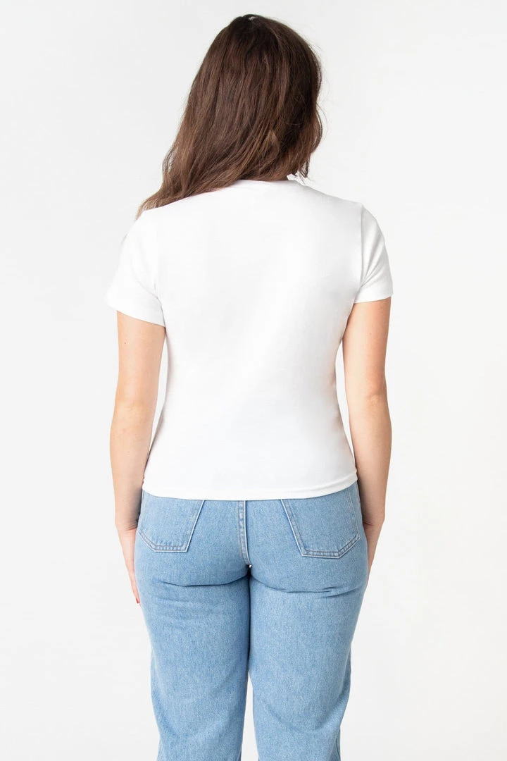 In the late 90s, Dov Charney led the resurgence of the classic baby tee with his ‘Classic Girl’ collection of soft, fitted t-shirts for women. We’ve brought back the baby tee with a few updates. Our Crew Neck Baby Tee has a more traditional neckline similar to that of a t-shirt and longer sleeves for extra comfort. This piece is timeless, and easy to wear year-round and is made of 100% combed cotton. Although this piece is currently only offered in one size, this fabric stretches up to 2 times the original fit to suit a variety of body types and has excellent durability through repeated washings. Best of all, it is made in Los Angeles where our workers earn fair wages.