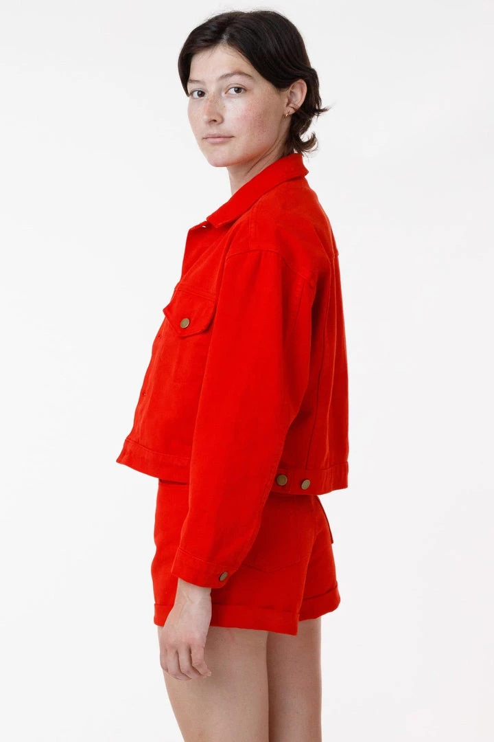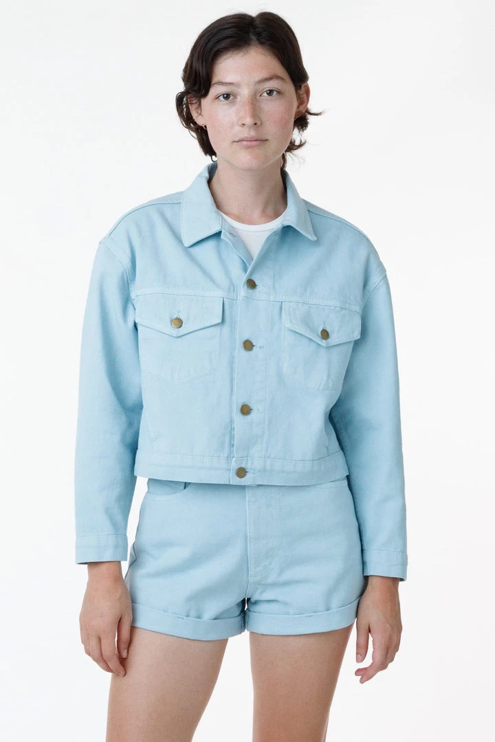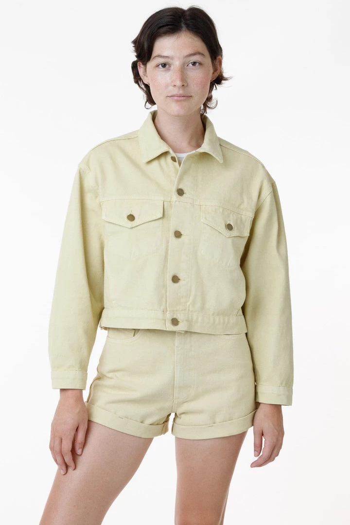 The Denim Jacket; a classic, effortless and cool staple piece that has found a place in anyone’s wardrobe no matter personal style. We’ve made a cropped version of this style and garment dyed it for a naturally worn-in feel and rich color. This style features an oversized, boxy cut with dropped shoulders shorter sleeves than the average denim jacket. Designed with 2 button flap chest pockets, and 2 angled welt pockets on each side for easy accessibility. Side hem adjusters have been added so you can personalize your jacket to fit the way you want on the waist. Constructed from 13 oz. bull denim to withstand wear and tear. Made by workers earning fair wages in Los Angeles.