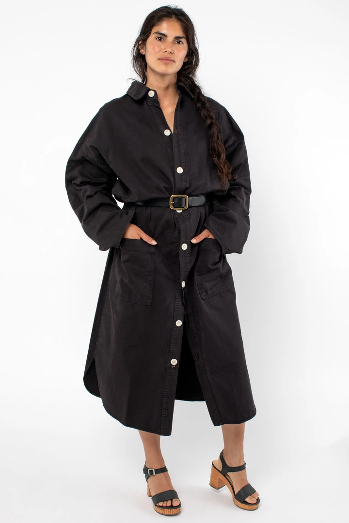 We consider ourselves t-shirt scientists at Los Angeles Apparel. We make our garments in Los Angeles so we can perfect our science. We experiment with and study the behaviors of the yarns and fabrics we use to bring you quality pieces that last. For this garment, we were inspired by a traditional scientist’s lab coat. The Lab Coat is made of a sturdy and structured 8 oz. Cotton Twill that has been garment dyed and enzyme washed so it’s not too stiff. Wear this piece on misty mornings or layer it with sweaters for chilly nights. The lab coat can be worn unbuttoned as an overcoat or buttoned all the way to the top as an oversized shirt-dress. Experiment with the endless ways to wear this seasonal staple.