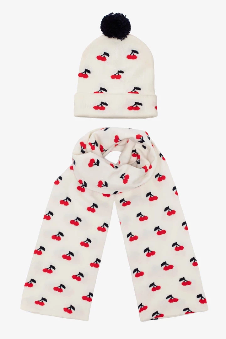 Coordinate your cold-weather look with the cutest cherry pom pom beanie and scarf. The beanie is long enough to be worn cuffed over the ears.