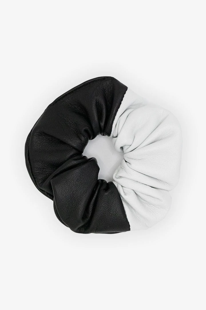 An elegant leather scrunchie to elevate your hairstyles. This two-tone scrunchie is made of soft lambskin leather to stay in place without slipping and to keep your hair from creasing and is slightly larger than our regular leather scrunchies This scrunchie is made in the USA by experienced sewers earning up to $20 an hour or more.