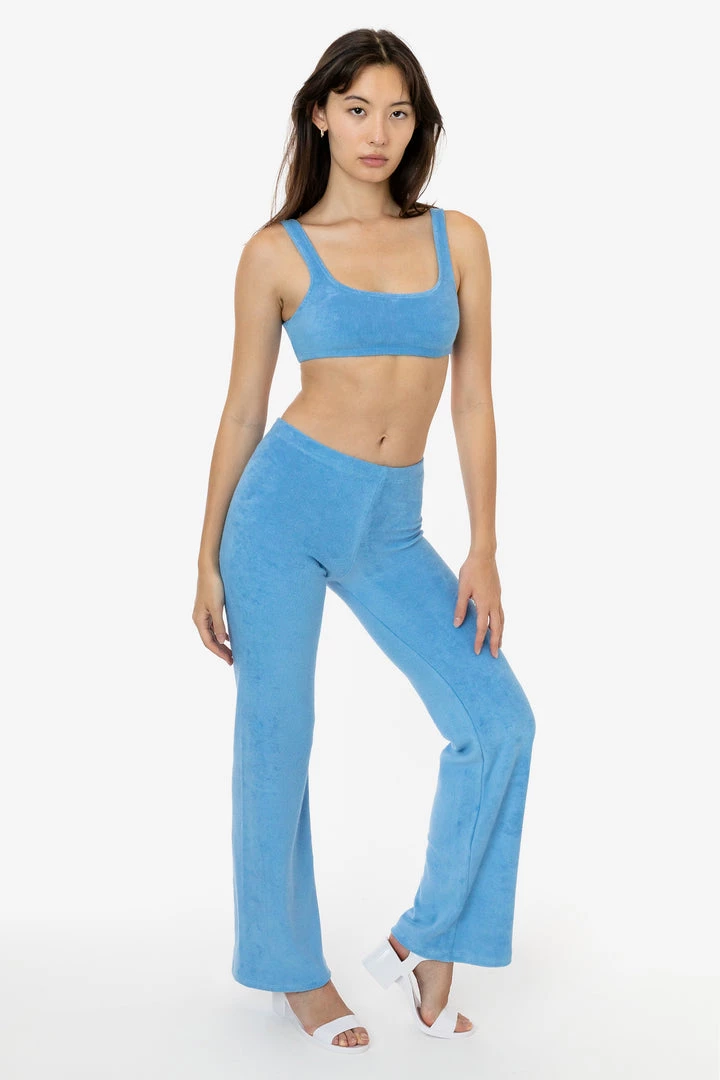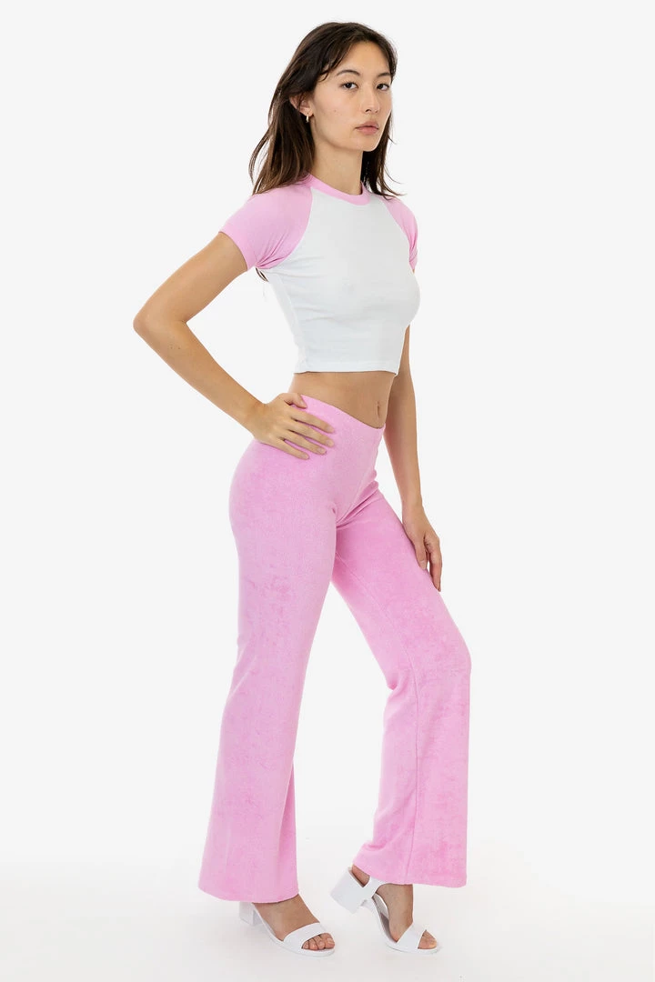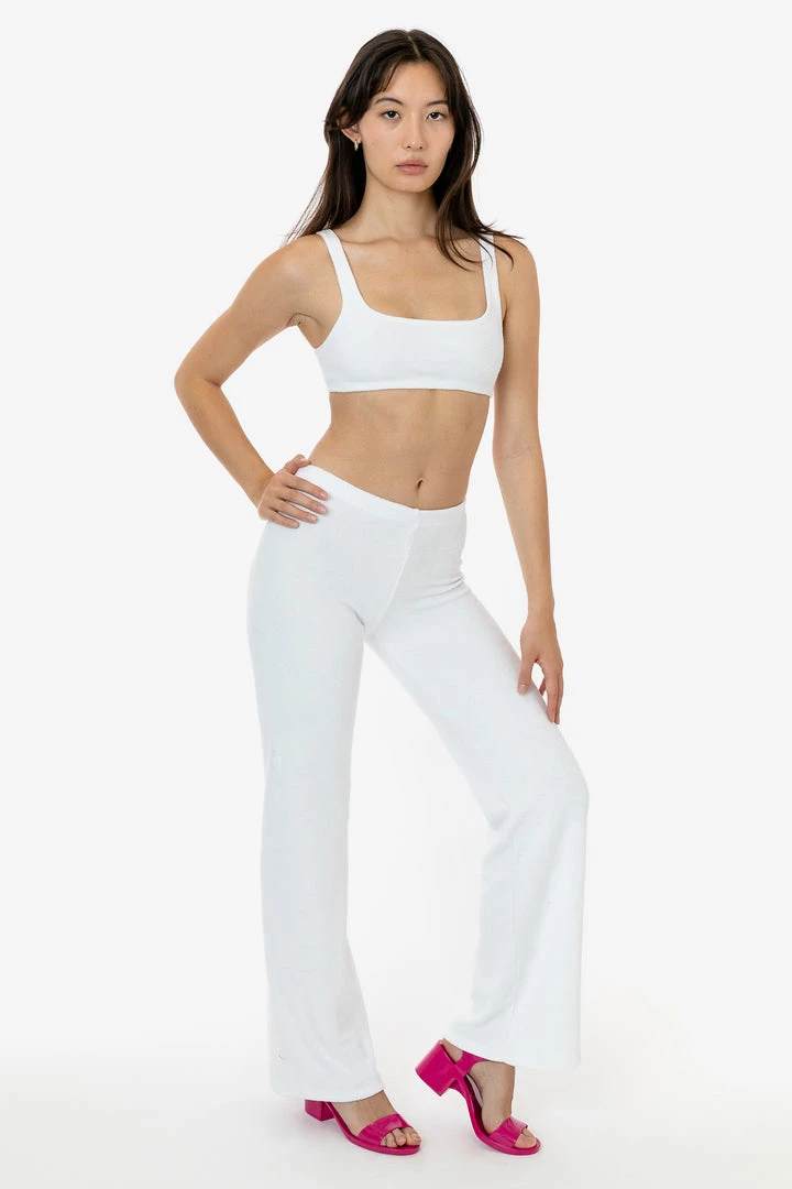 These versatile loop terry pants will elevate your loungewear or make the perfect layering piece after the beach. They feature a low to mid-rise fit and flared leg for a dressier look when desired. Pair with one of our bodysuits or matching loop terry tops for a fun dinner outfit or one of our matching baby tees for a more casual approach. Our loop terry has a subtle, natural stretch and a stretchy elastic waistband make for a comfortable fit for any occasion.