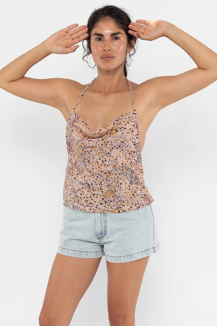 This halter top drapes loosely at the neckline and can be worn high or dangerously low. Great for layering over a swimsuit or worn on its own on sweltering summer nights.