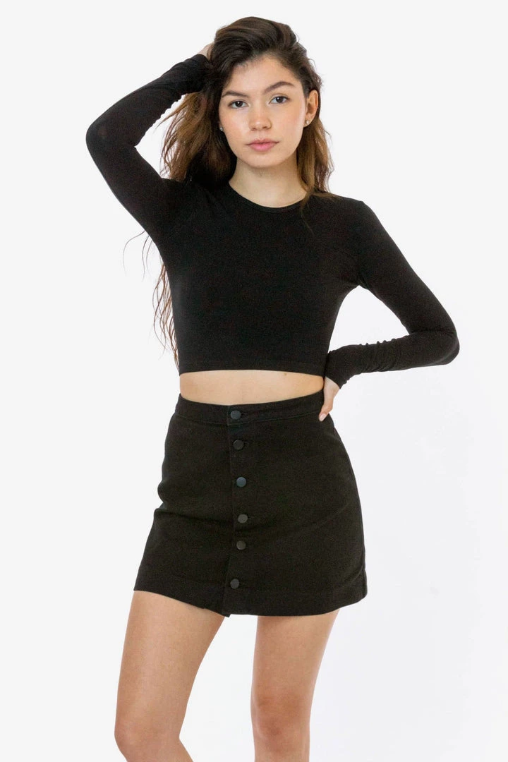 The original button-front skirt is made of durable 100% cotton denim and features an a-line silhouette. Pair with tights and a turtleneck in the winter or with your favorite crop top for summer. This skirt has a high waisted fit and runs true to size.
