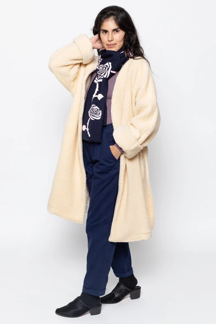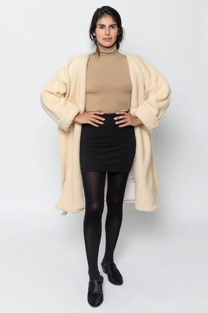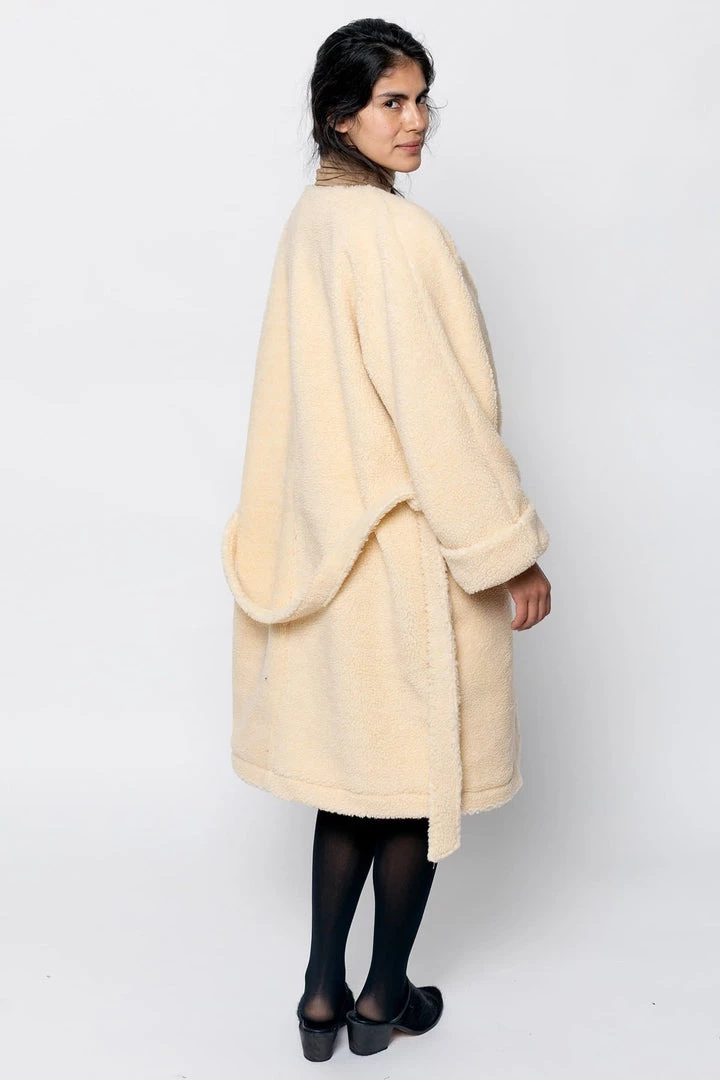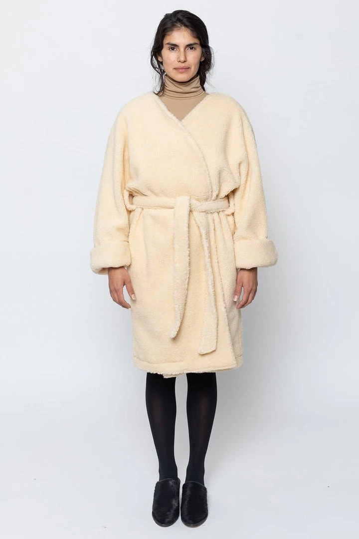 The Oversized Sherpa Wrap Coat is fully lined with soft cotton jersey to provide comfort and warmth in the winter months. It’s surprisingly lightweight and cozy enough for lounging around the house, but can also be dressed up for outdoor wear.