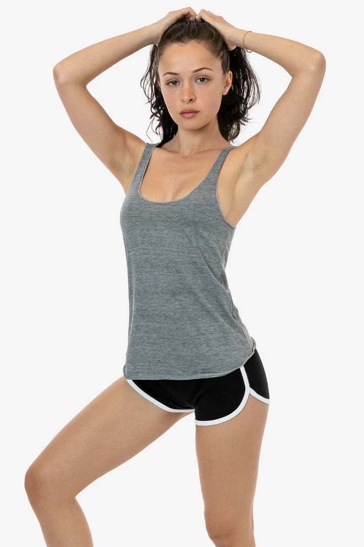 This nostalgic tank top is made of our original Tri-Blend yarn pioneered and popularized by Dov Charney over a decade ago. This tank has features low cut armholes, a narrow racerback design and overlock-finished edges for a barely-there feeling on. Perfect for lounging and jogging.