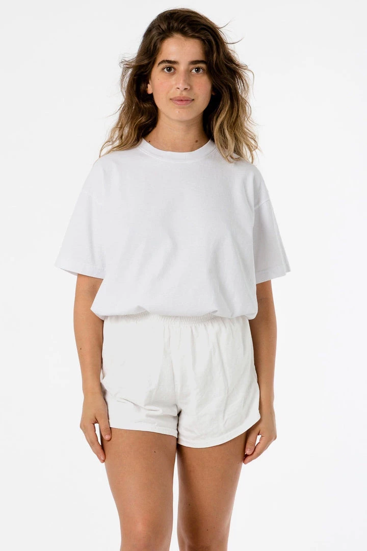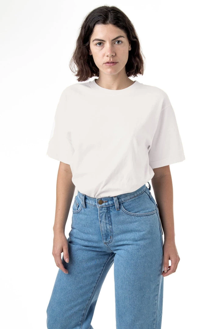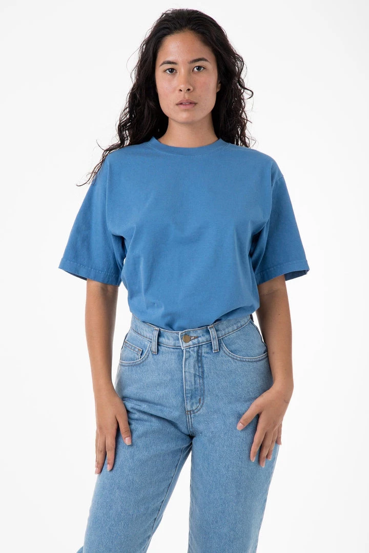 We believe this T-shirt will cause a thematic shift in the T-shirt industry. Made of 100% USA cotton, this textile is beefy, durable, and absorbent, and is virtually shrink free as a result of garment dyeing. The garment is washed with natural enzymes, resulting in a broken-in feel, just like a T-shirt that was washed or worn for a decade or two. Its special features include its heavy and sturdy feel and combined with a more generous fit (about 1 wider on the flat than a contemporary T-shirt) and higher neck line.