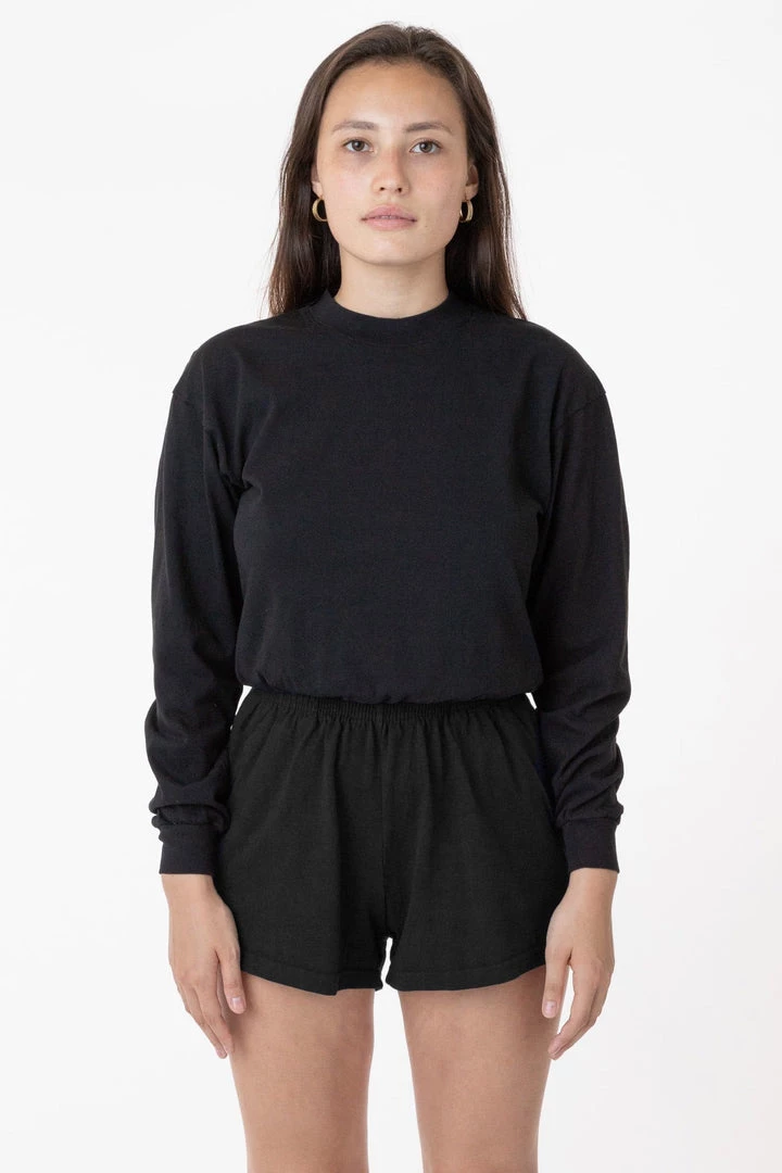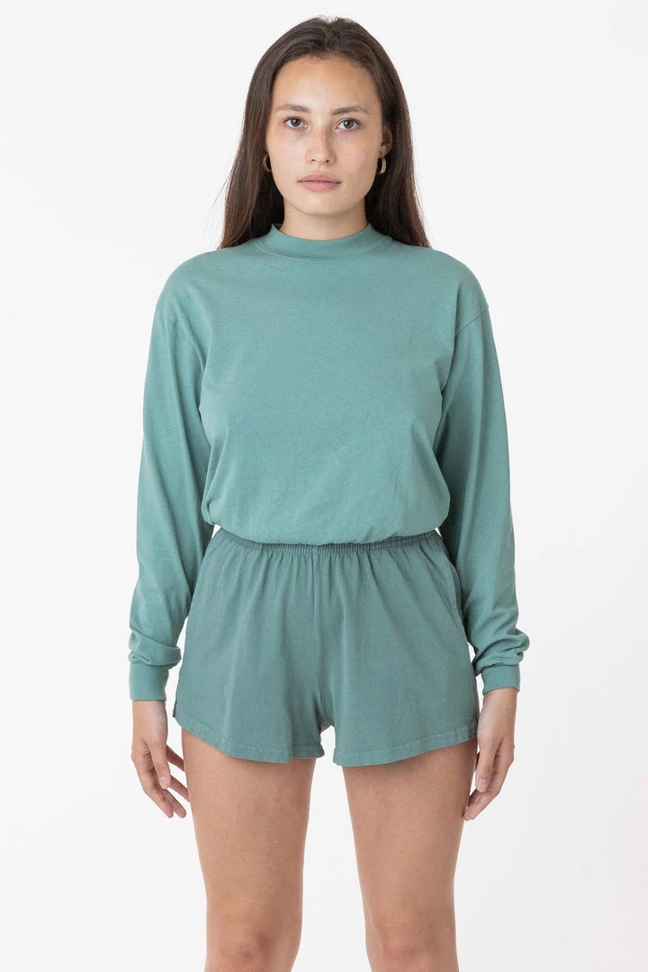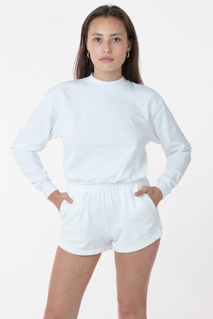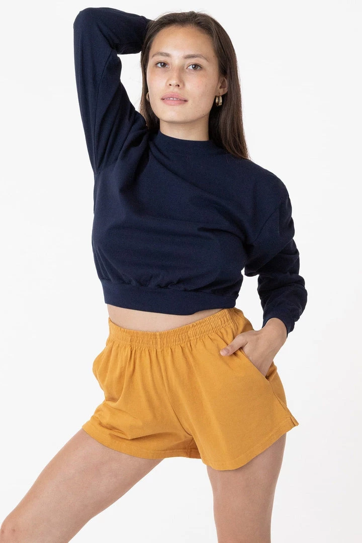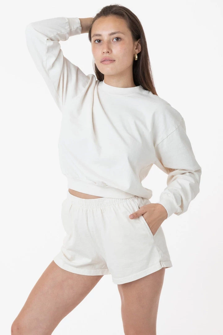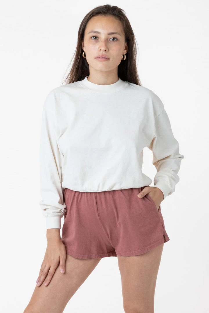 A feminine take on our Unisex Gym short. Perfect Short Shorts for the gym or your Sunday morning at home. These shorts are part of our garment dye line, which is always custom dyed, shrink-free and sewn with 100% USA-grown cotton.