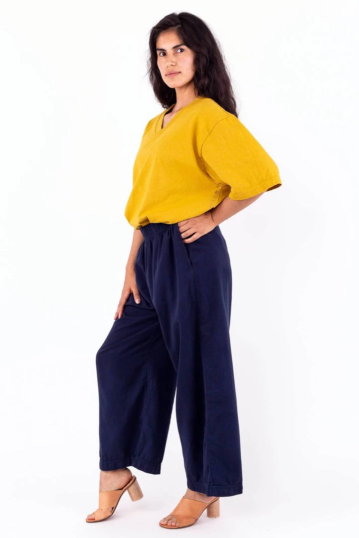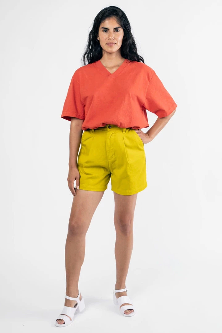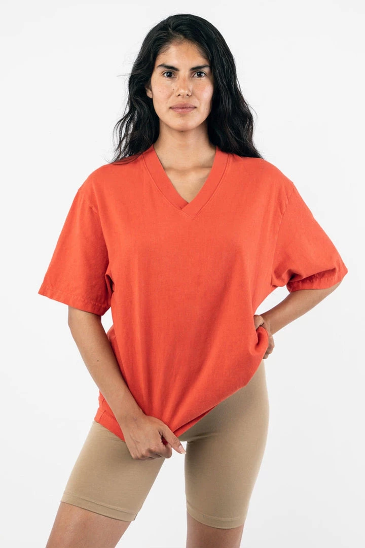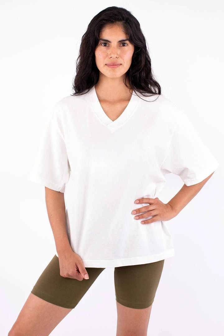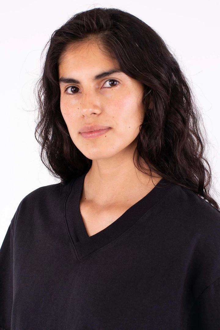 Constructed out of 14/1 cotton jersey, the Boxy V Neck T-Shirt features an alternative silhouette for women in comparison to our crewneck T-shirts, with a neckline that emphasizes facial features and slightly structured sleeves for strong shoulders. The fabric has a heavier feel than the 1801GD as it is knit using a thicker yarn. The result is a garment that looks and feels substantial. Finally, we also treated this style with natural enzymes to give it the perfect broken-in effect, while remaining shrink-free and fade resistant.