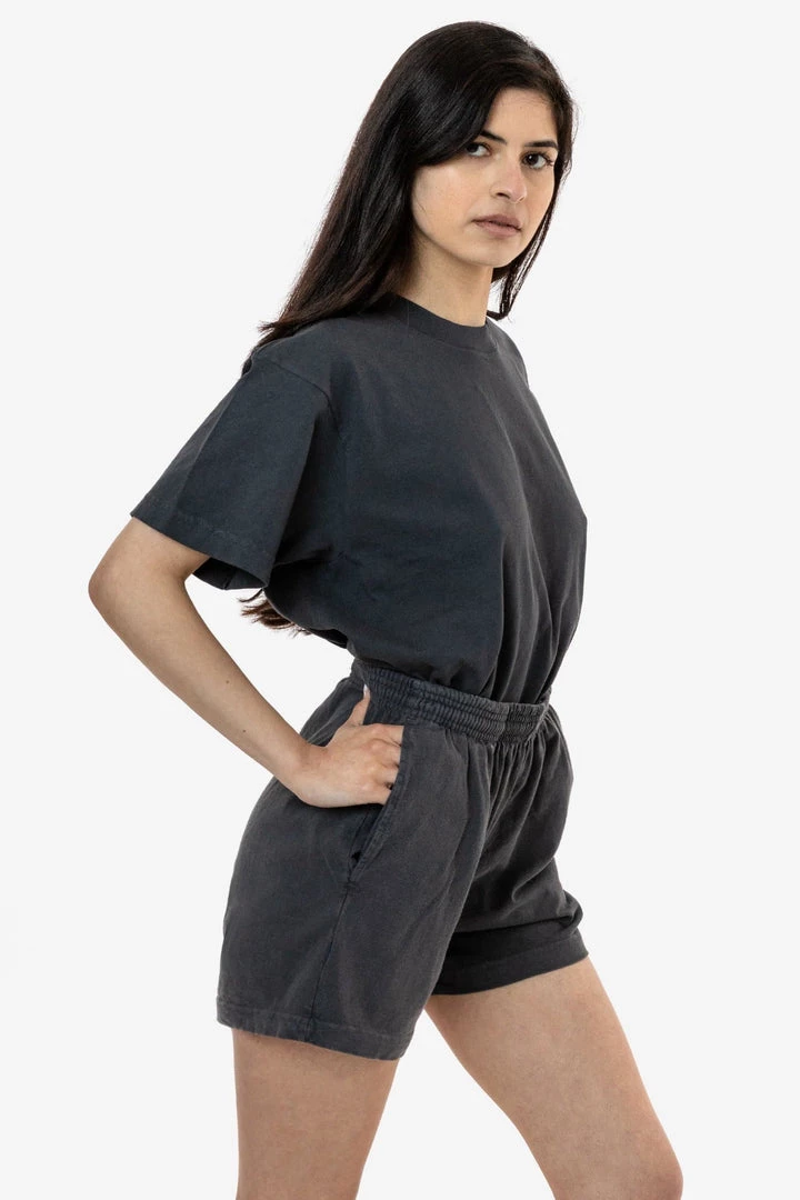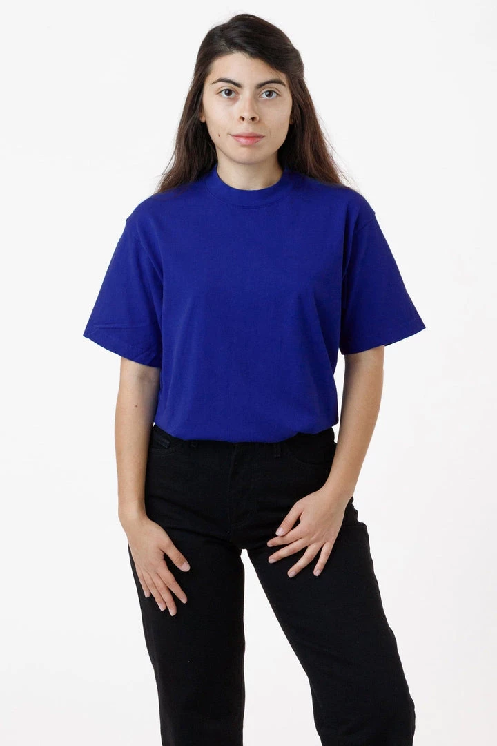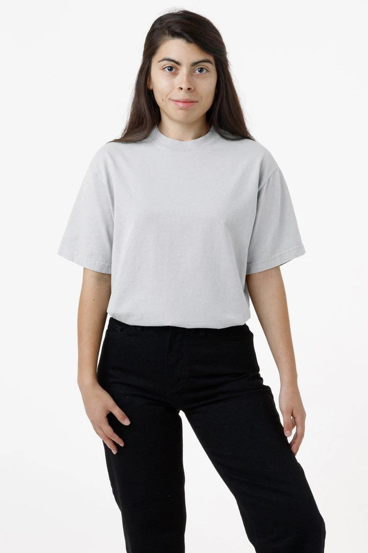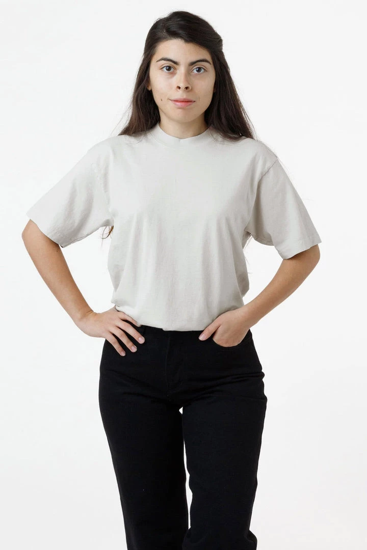 We believe this T-shirt will cause a thematic shift in the T-shirt industry. Made of 100% USA cotton, this textile is beefy, durable, and absorbent, and is virtually shrink free as a result of garment dyeing. The garment is washed with natural enzymes, resulting in a broken-in feel, just like a T-shirt that was washed or worn for a decade or two. Its special features include its heavy and sturdy feel and combined with a more generous fit (about 1 wider on the flat than a contemporary T-shirt) and higher neck line.