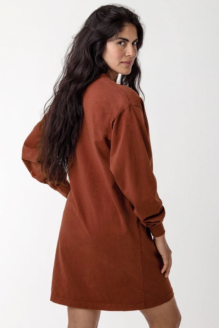 Thick, long-sleeve T-shirt Dress with a higher neckline and a comfortable loose-fitting silhouette. This dress is part of our garment dyed line, which is always custom dyed, shrink-free and sewn with 100% USA-grown cotton.