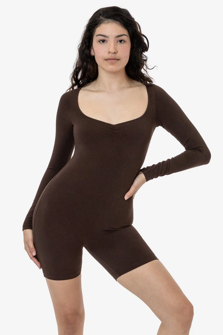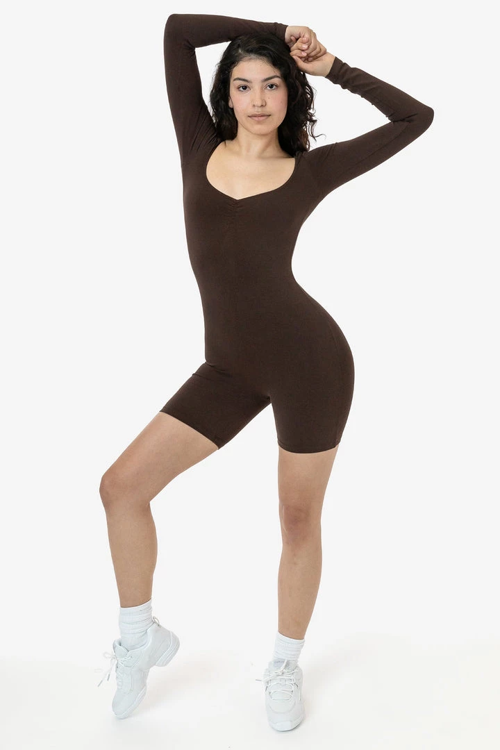 This danewear-inspired biketard is made for movement. This feminine one piece features a wide, sweetheart neckline with a ruched detail at the bust and an elegant full coverage back. Wear this fitted style alone for a flattering look that showcases your body or layer with skirts or sweatpants. This unitard is made of a heavyweight cotton spandex with extra compression and has been garment dyed and enzyme washed providing unique colors and a smooth texture.