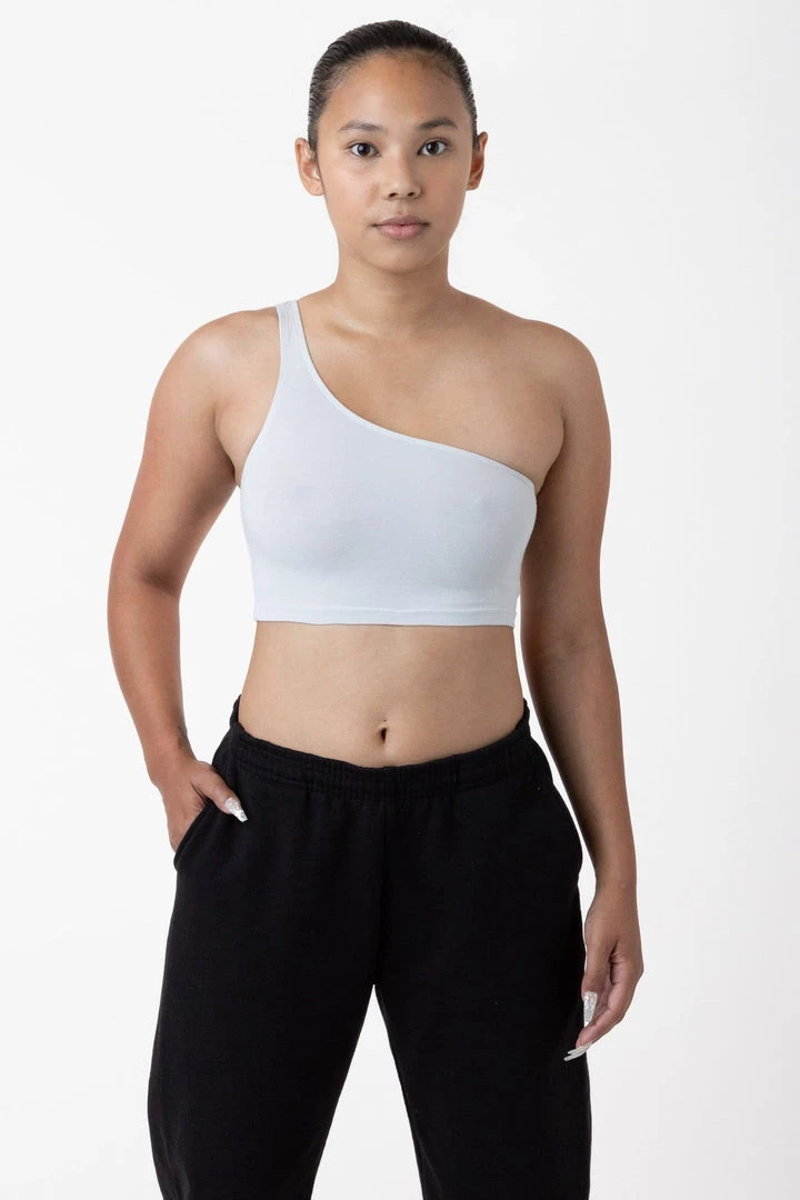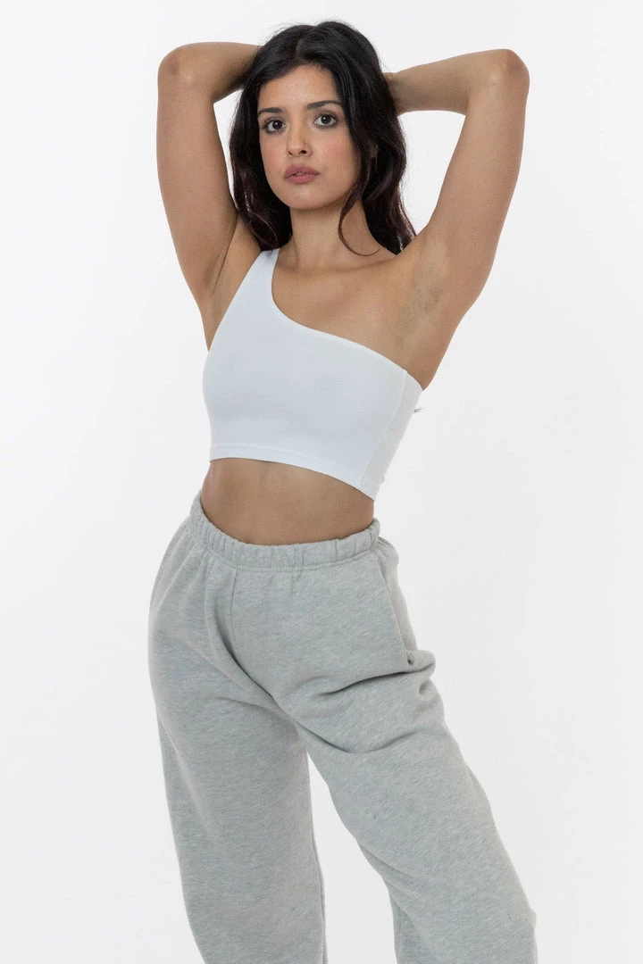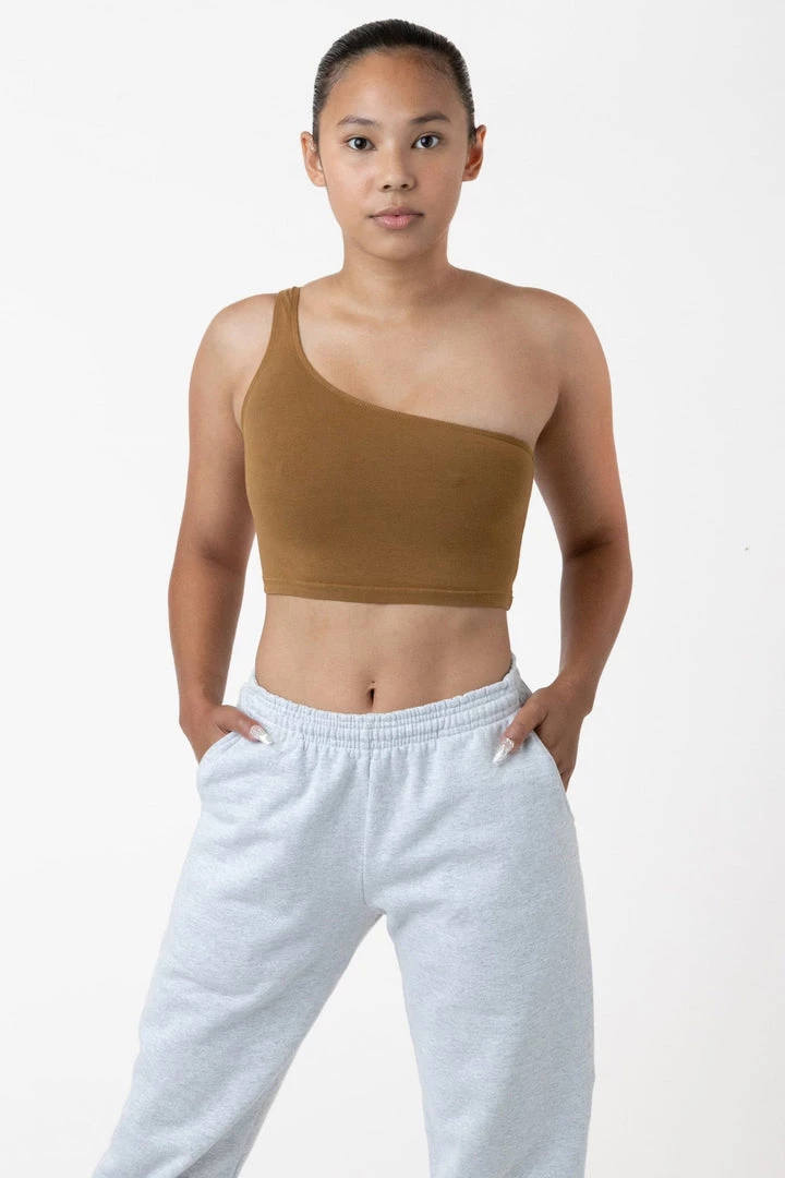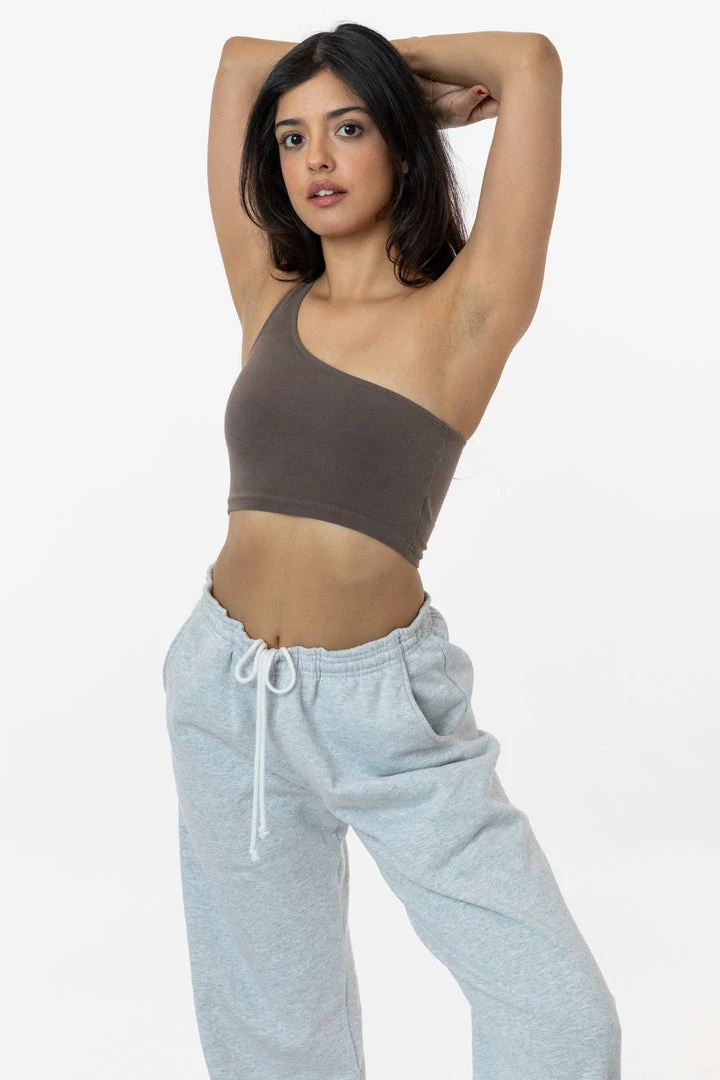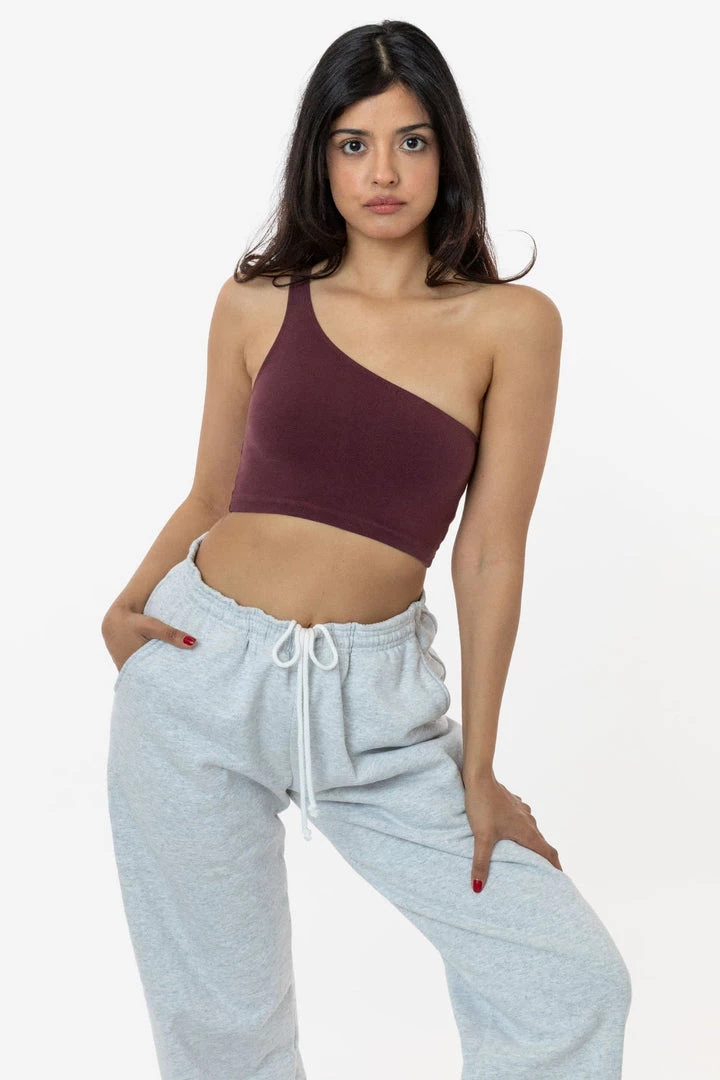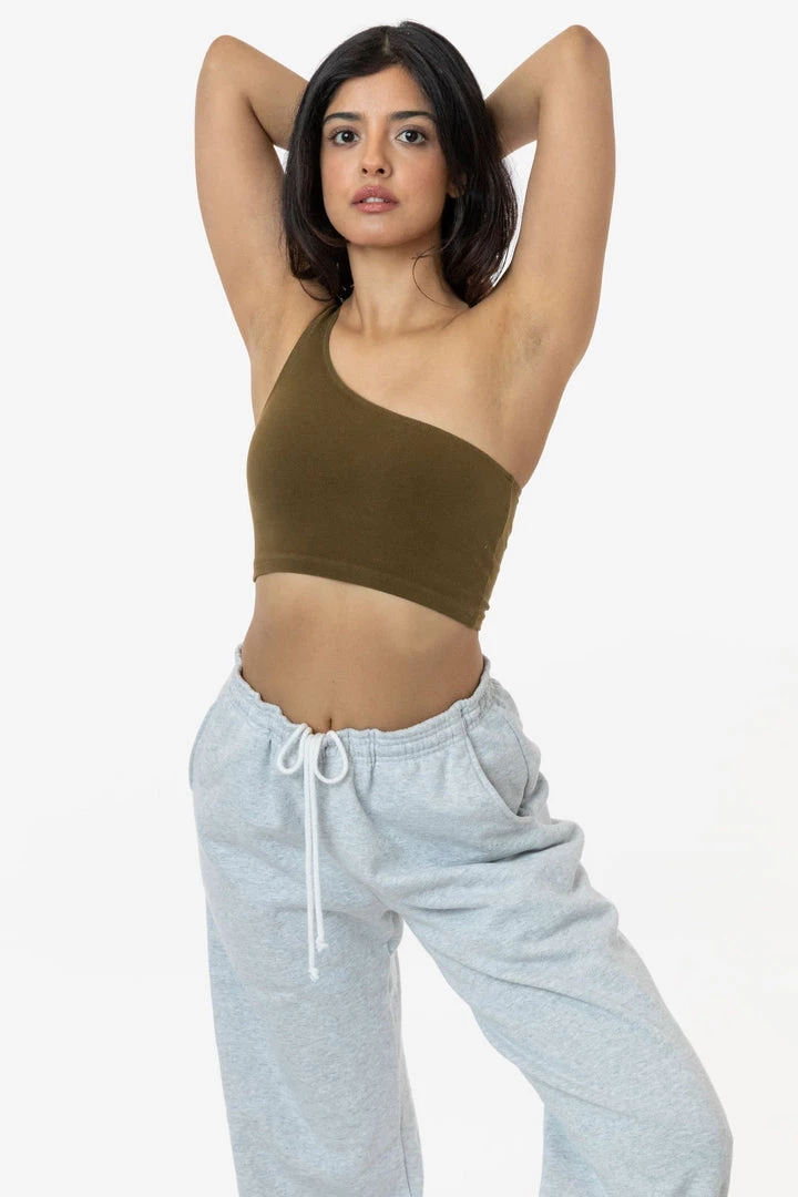 The Garment Dye One Shoulder Crop Top is a wardrobe staple in between a bralette and a crop top. Featuring a super cropped length and looks great underneath an oversized jacket with any style of bottoms, from sweatpants in the daytime or a fitted pant at night. This style is made of a premium cotton spandex with extra compression, so it is less flimsy than most crop tops, and has been garment dyed and enzyme washed providing unique colorways and rich texture. Made in South Central, Los Angeles by experienced seamstresses earning fair wages.