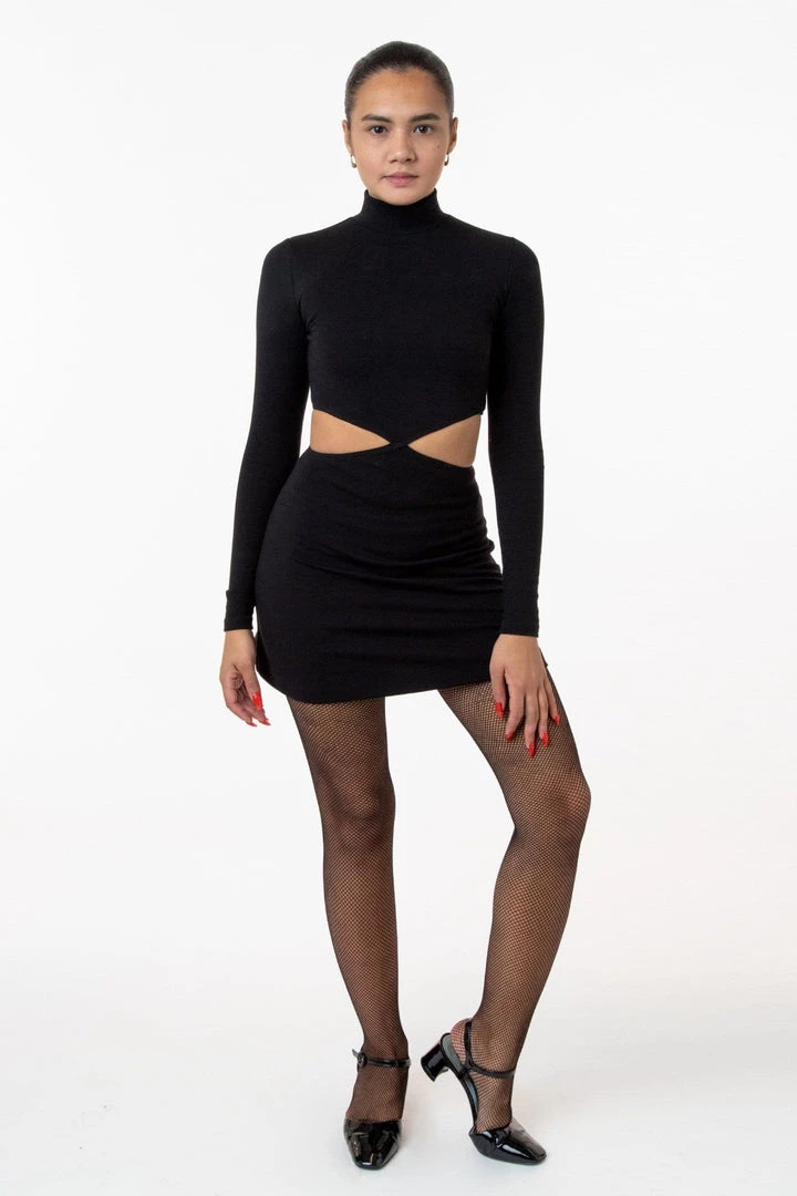 The Ponte Mini Dress is made of a smooth, flattering blend of Rayon, Nylon and Spandex with high compression to leave you feeling poise. This style features a mock neck and long sleeves with a diamond silhouette and side cutouts that finish like a two-piece set at the back. The mini, slight a-line shape flatters your legs without being too tight. Pair this dress with our hosiery and fishnets and a pair of heels for your next dinner or cocktail event.