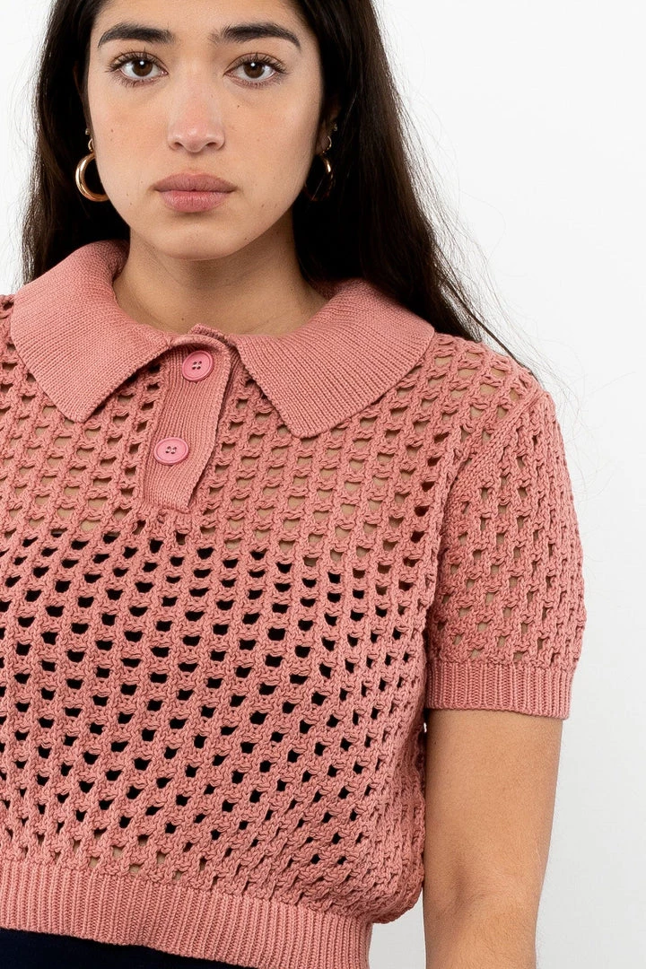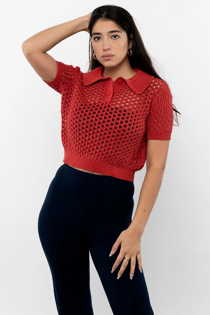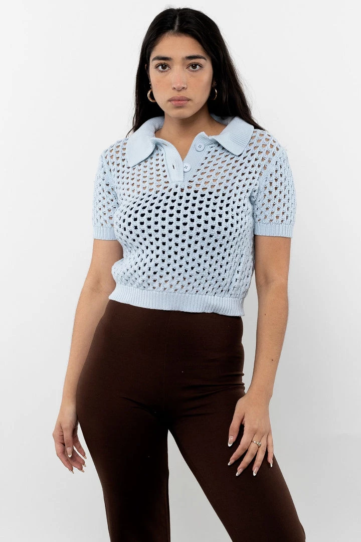 This piece is a shrunken, cropped polo sweater for the warmer months. Made of 100% Cotton, the net-like knit will make sure there’s plenty of airflow when the temperature spikes. Pair this item with any of our intimates or cotton spandex crop tops for a peek a boo effect.
