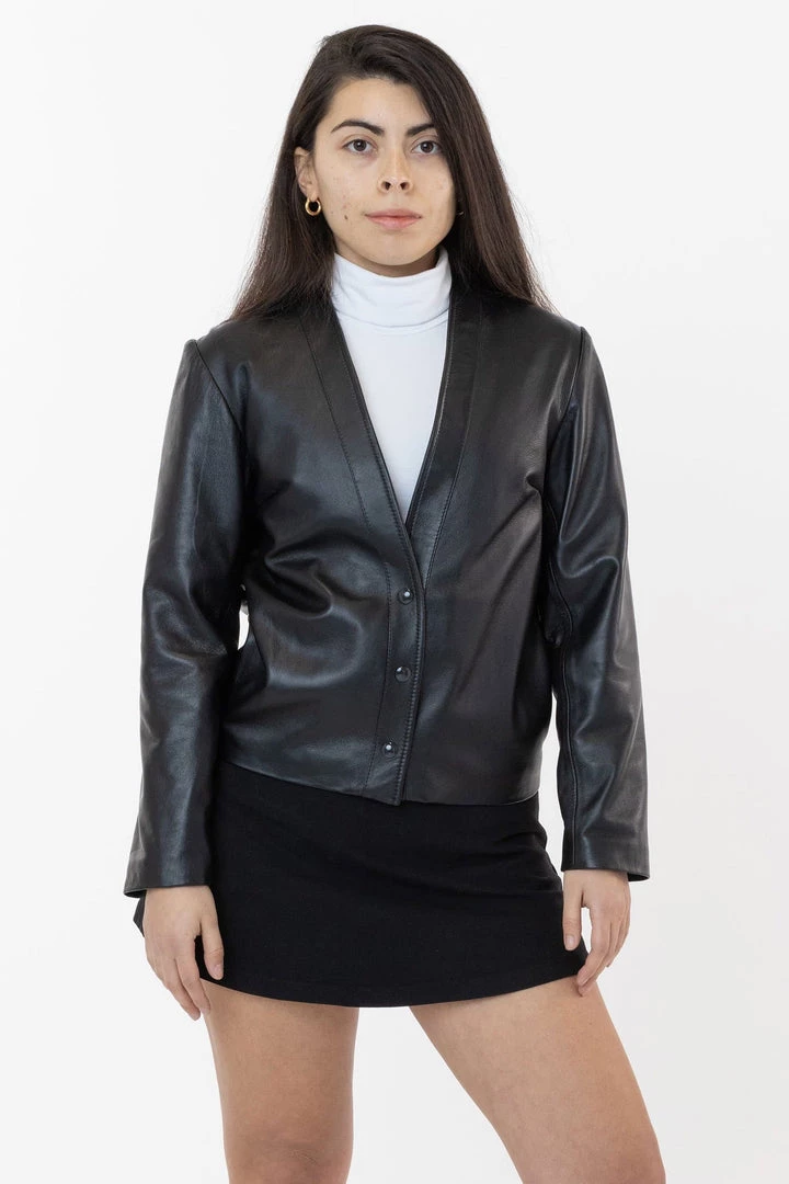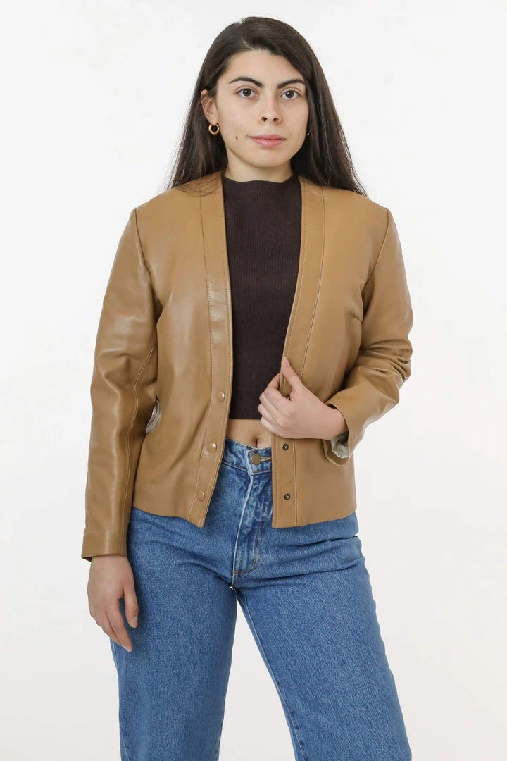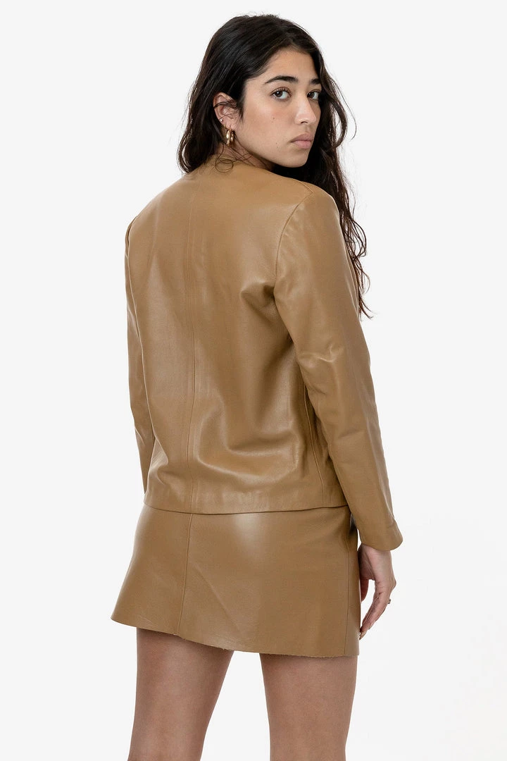 Our Leather Collarless Blazer is made from a buttery-soft leather that is known for being a light-weight all-season leather with natural stretch. We’ve lined this product with a lightweight stretch cotton lawn fabric and is perfect for those who prefer a cotton lining over the usual synthetic lining that is used as a popular lining in leather garments. We’ve added darts and the bust to add shape and has 3 snaps at the front, giving it flexibility to be worn closed or open. This labor intensive garment is Made in the USA by workers earning a fair wage