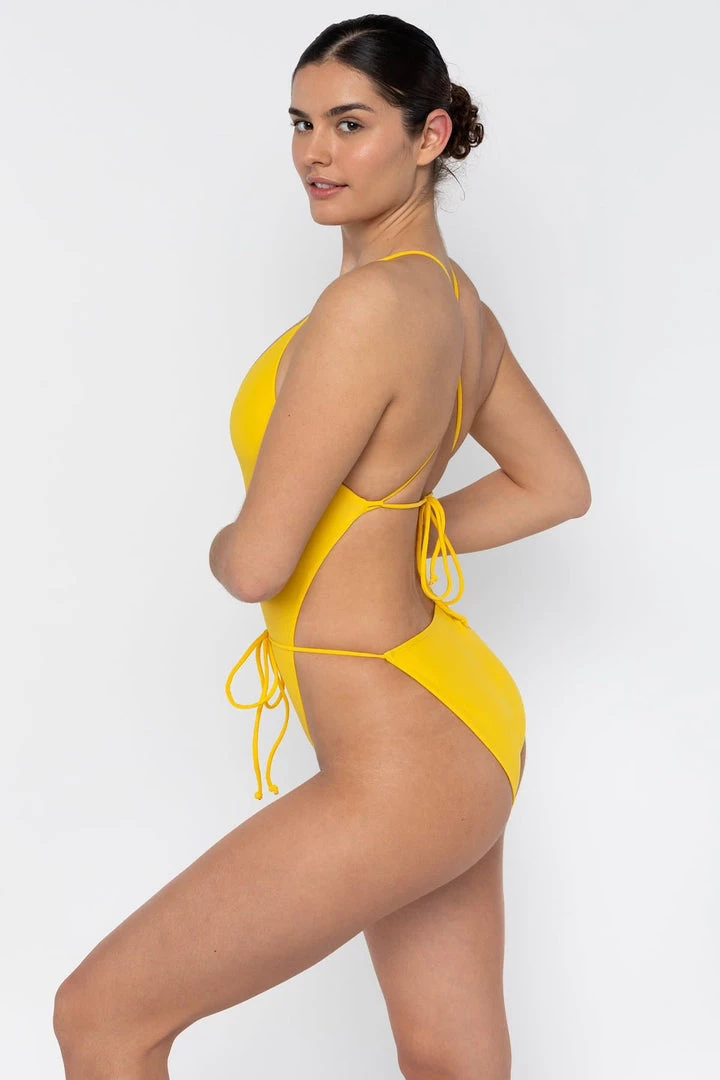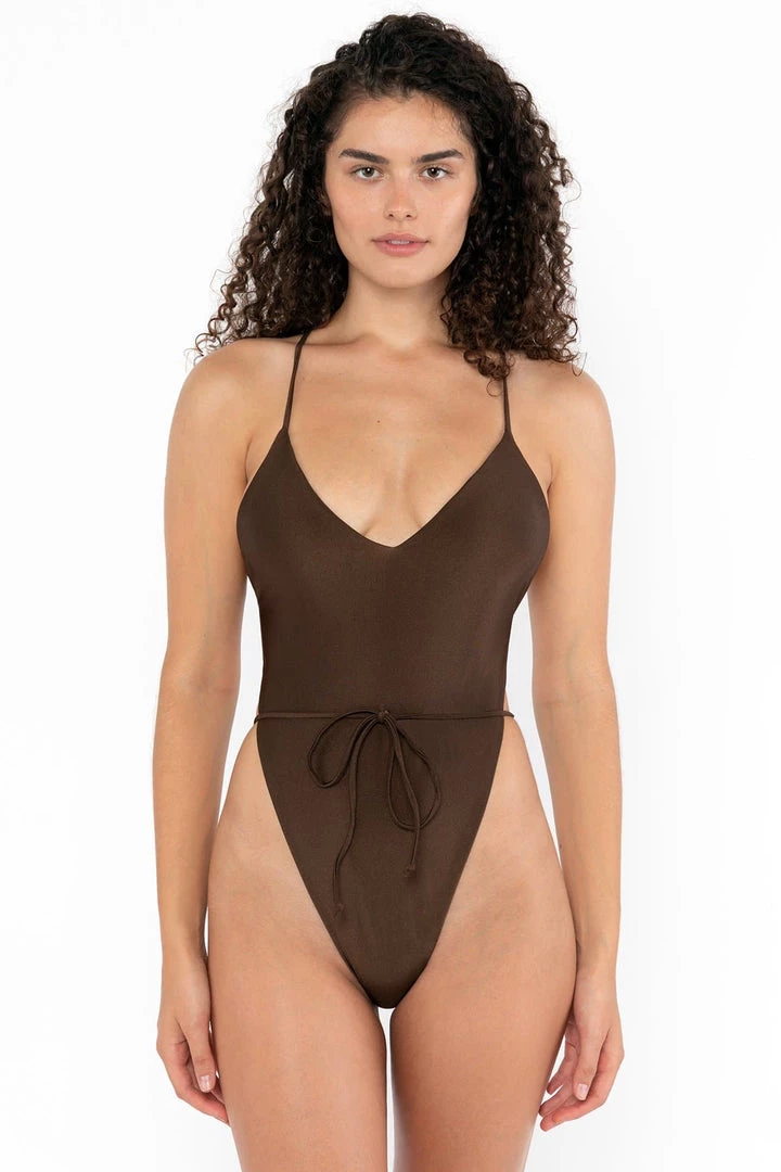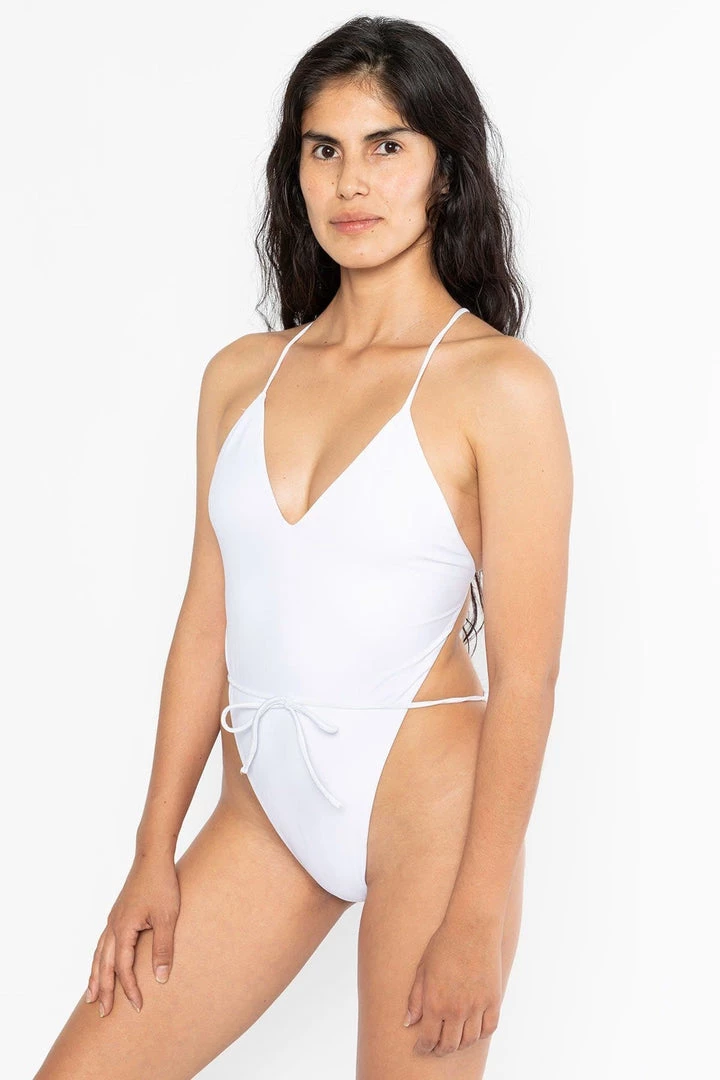 This vintage-inspired high cut monokini will elongate your legs and accentuate your curves at the beach or by the pool. It features an adjustable wraparound front tie that holds everything in place and a multi-wear strappy back with lots of opportunities to tie. This bathing suit has a v-shaped neckline that amplifies your cleavage and has a seamless finish at the top. This swimsuit is fully lined for active use. Made by experienced seamstresses earning fair wages in South Central, Los Angeles.