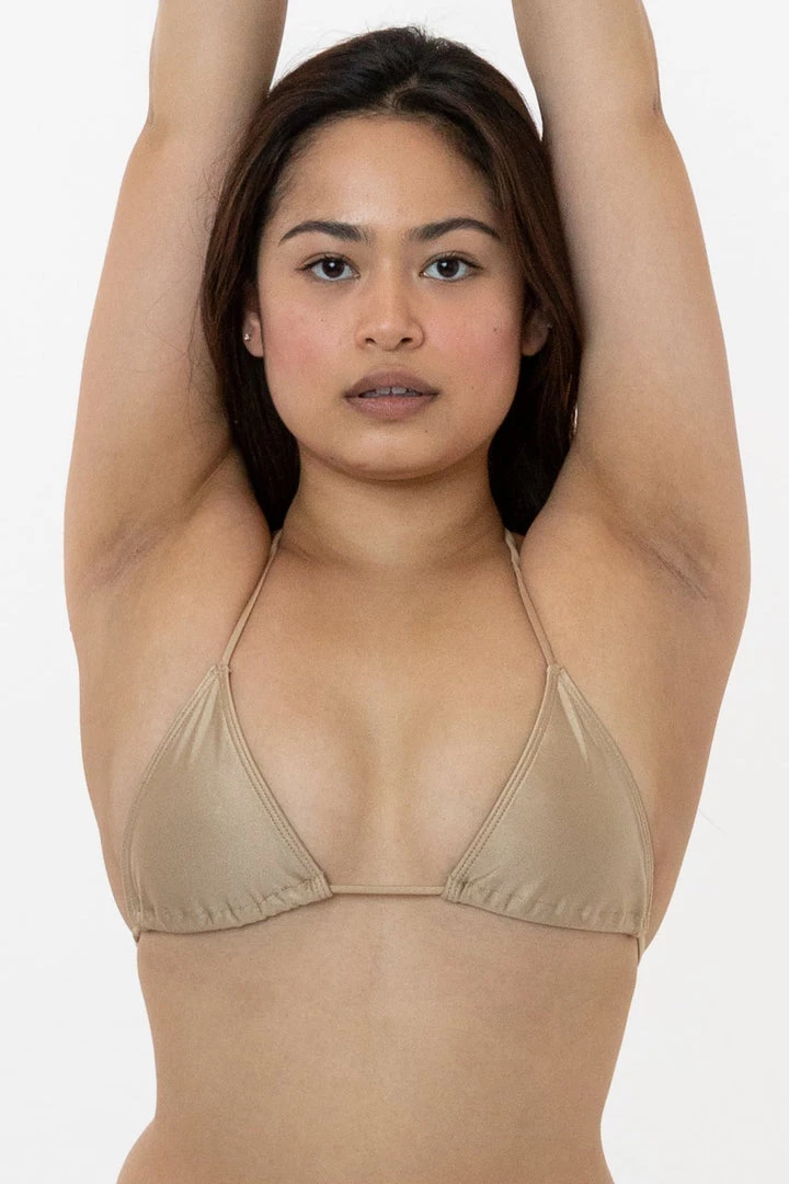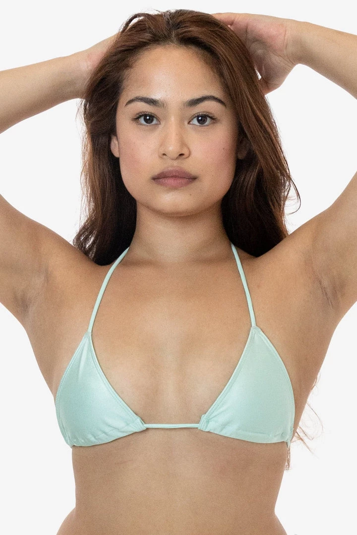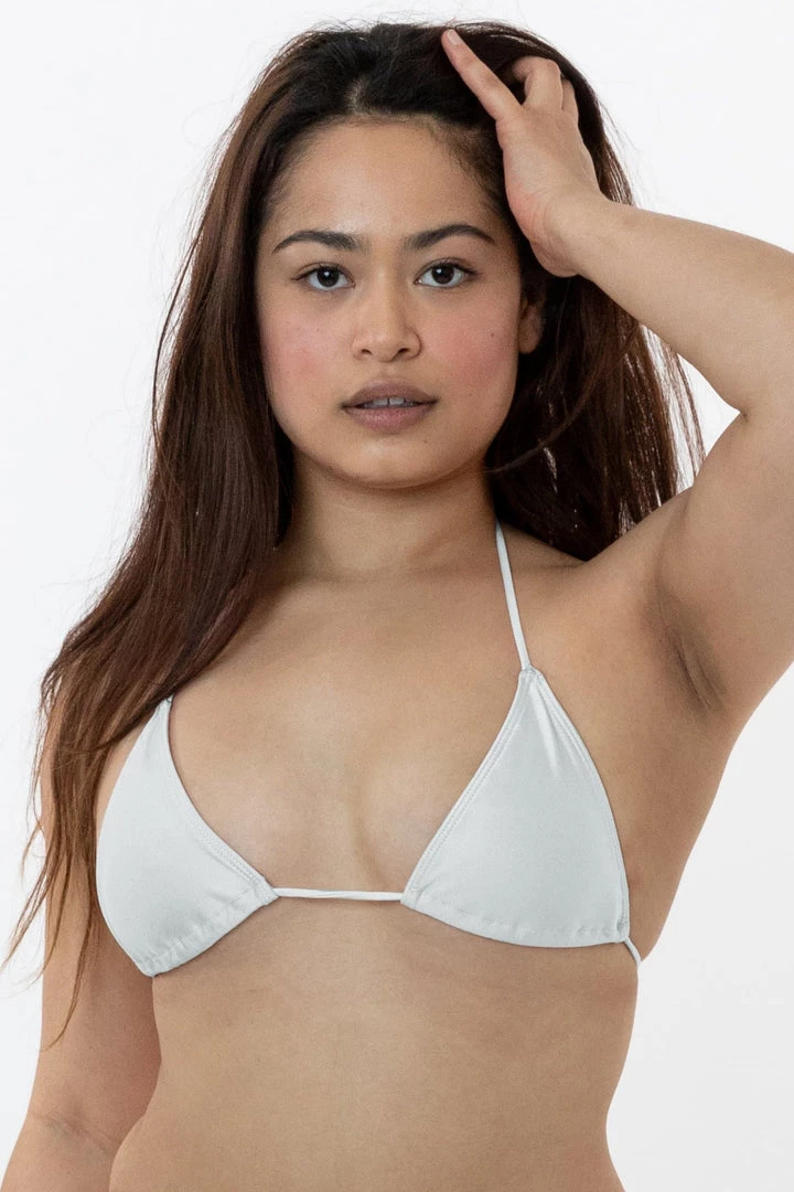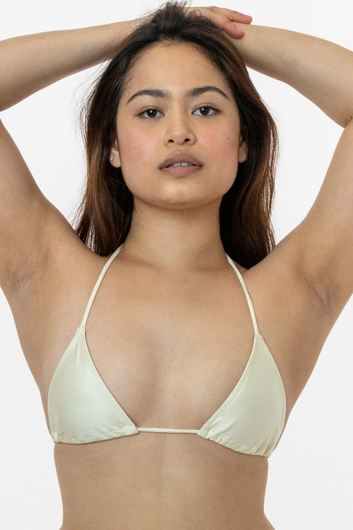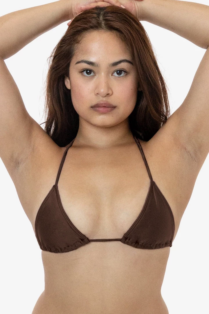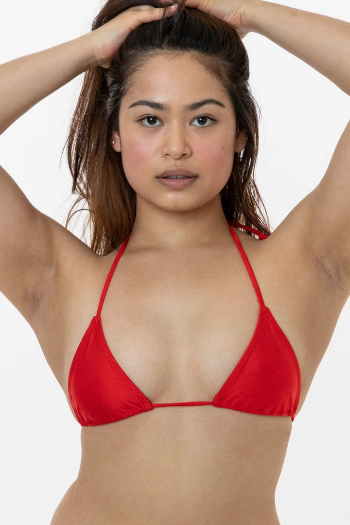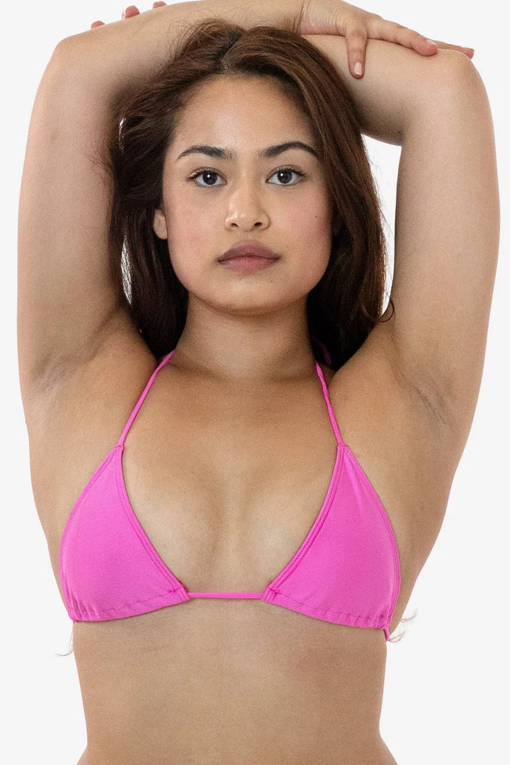 An iconic bikini top with spaghetti strings that tie behind the neck and back for an adjustable fit. This style has been updated with longer, narrow cups for a more 90s inspired look. Try scrunching the cups for a more revealing look or if you prefer a more traditional bikini, the cups are still large enough to accommodate your needs. Mix and match these tops with our RNT3004 String Bikini Bottom and other swim styles.