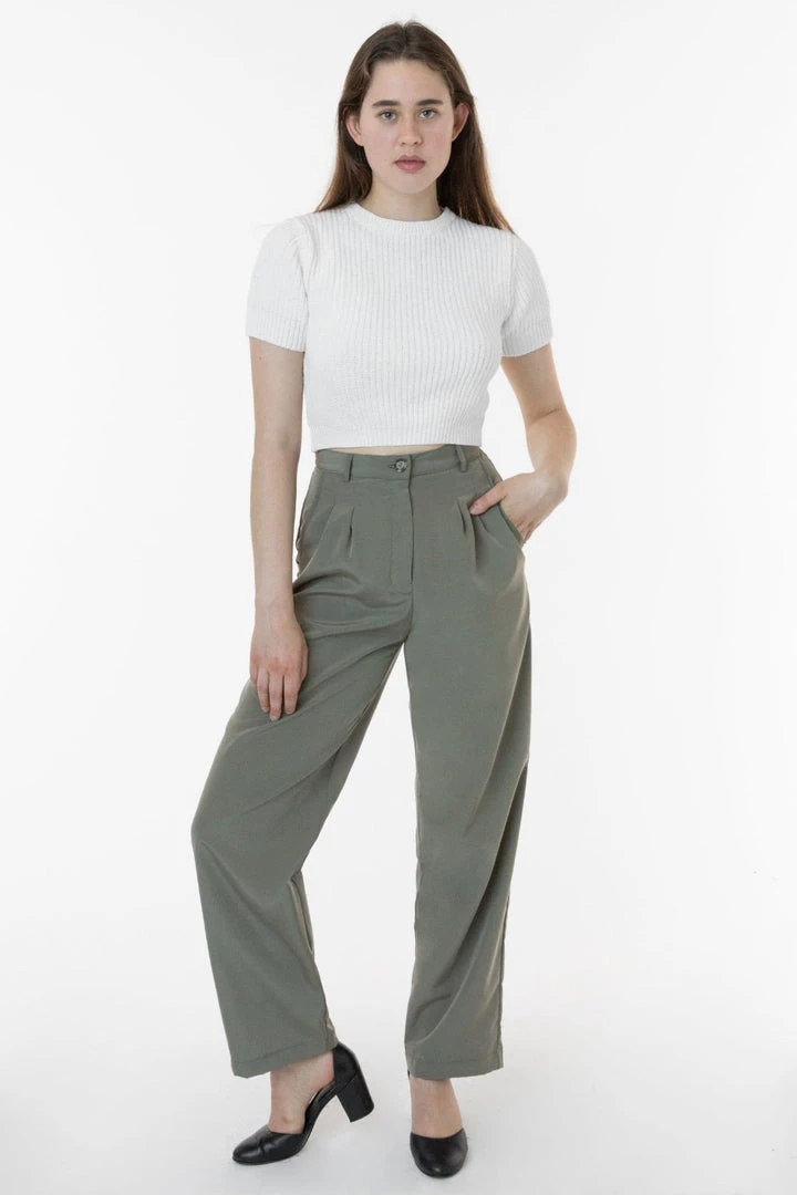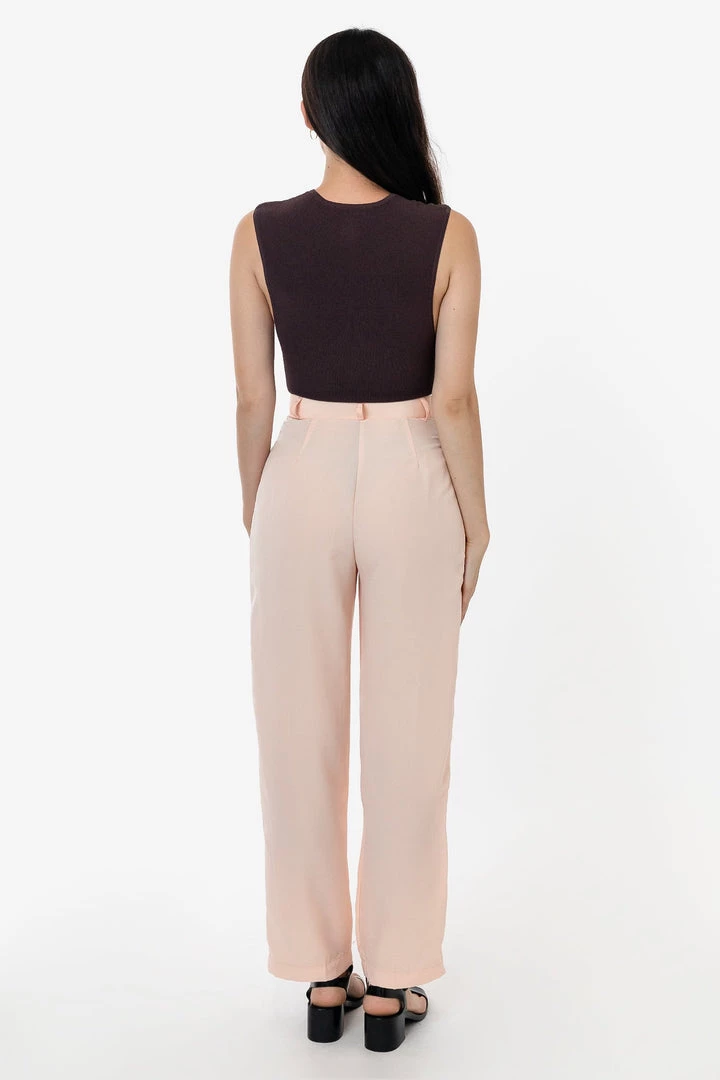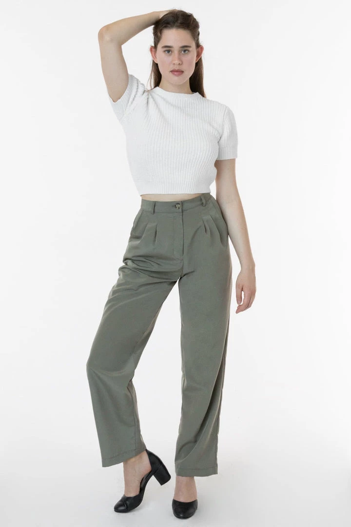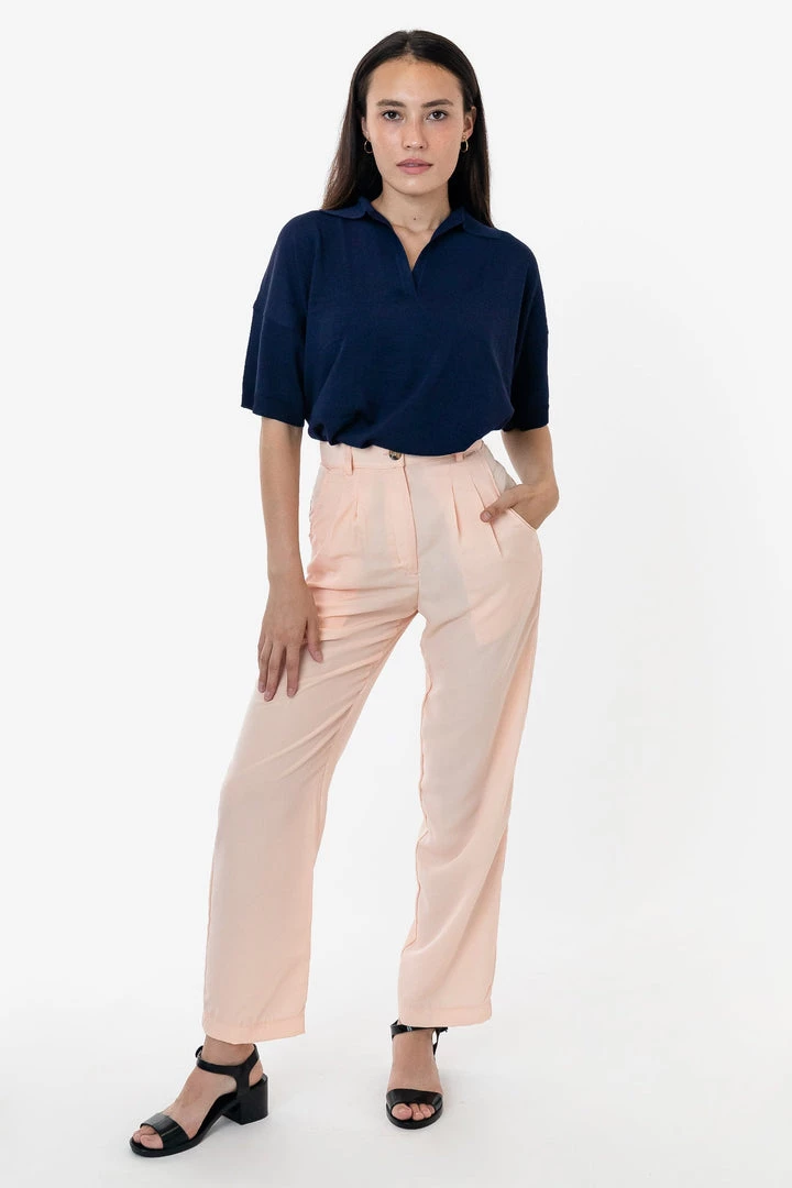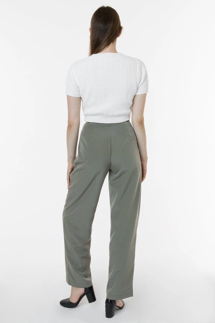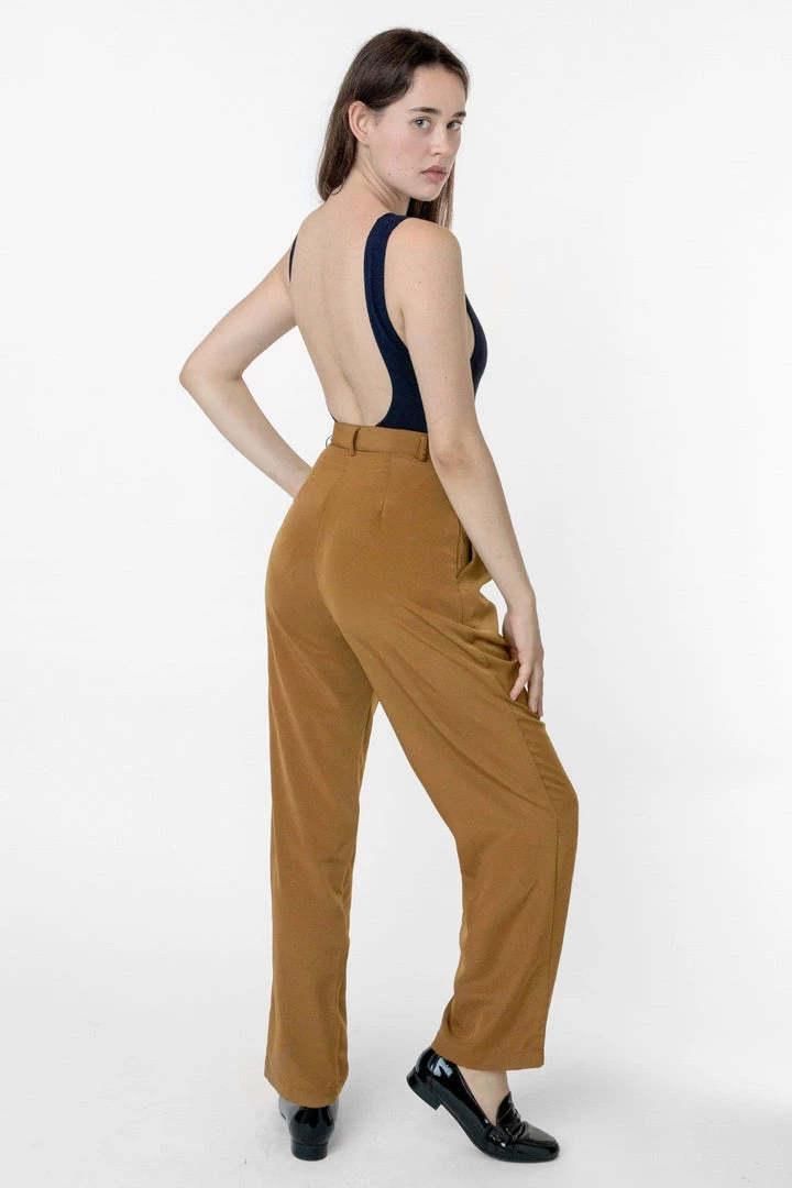 Our updated take on your tailored favorite. The new Poly Pleated Pant features a wider, straight leg with the classic high-waisted fit, front pleats, back darts and 2 side pockets. Made of a lustrous polyester that shines and highlights for an elegant look. The front-zip fly finishes with a tortoise button closure and this style features belt loops so you can style them with your favorite belt. Pair these pants with anything from a bodysuit, blouse or crop top for an effortlessly, polished outfit. The breezy leg width makes this style comfortable and moveable with a weight suitable for all temperatures year-round.